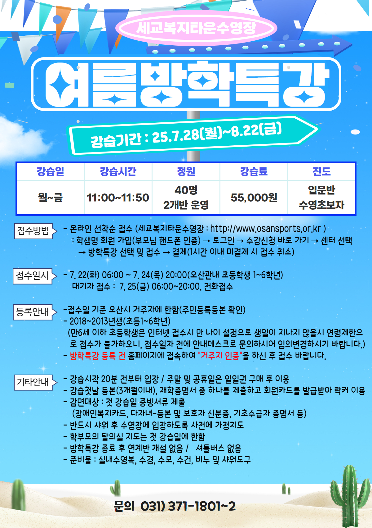 세교복지타운 수영장 [세교]여름방학 특강 개설 안내 작성자 osansisul01 등록일자 2025년 7월 1일 8시 16분 19초 조회 967 [세교]25.여름방학특강.jpg [ Size : 1.72MB , Down : 1,380 ] 미리보기 다운로드 목록보기
