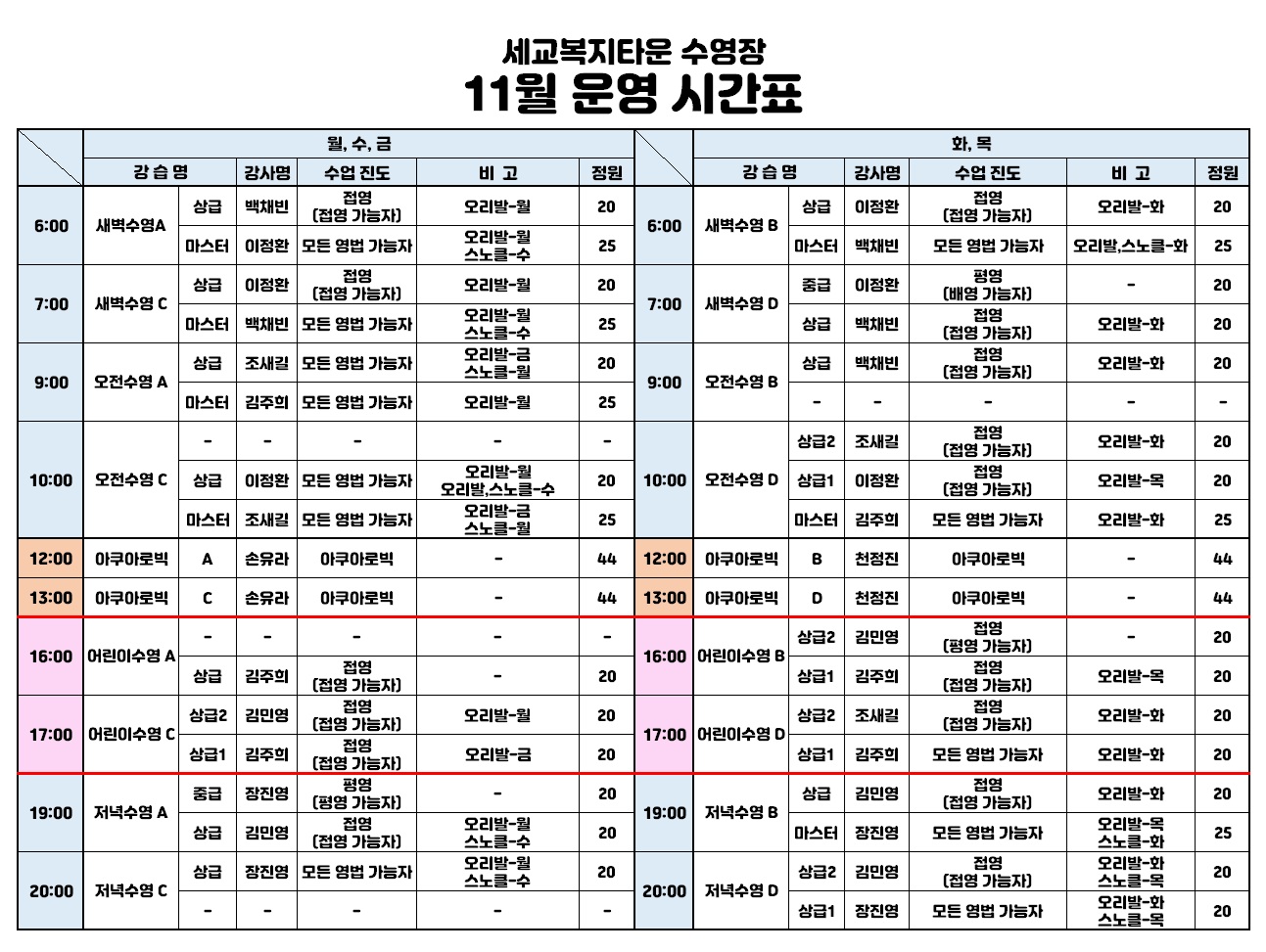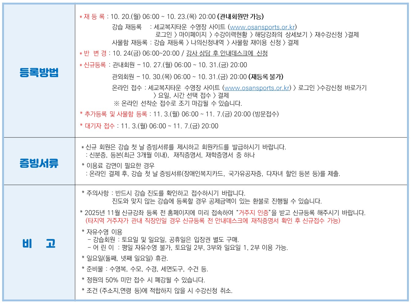 세교복지타운 수영장 [세교] 11월 진도표 작성자 osansisul01 등록일자 2025년 10월 15일 10시 23분 53초 조회 834 [세교]11월 진도표.jpg [ Size : 391.09KB , Down : 1,273 ] 미리보기 다운로드 25년 11월 수영 접수 안내문.jpg [ Size : 268.17KB , Down : 1,153 ] 미리보기 다운로드 목록보기