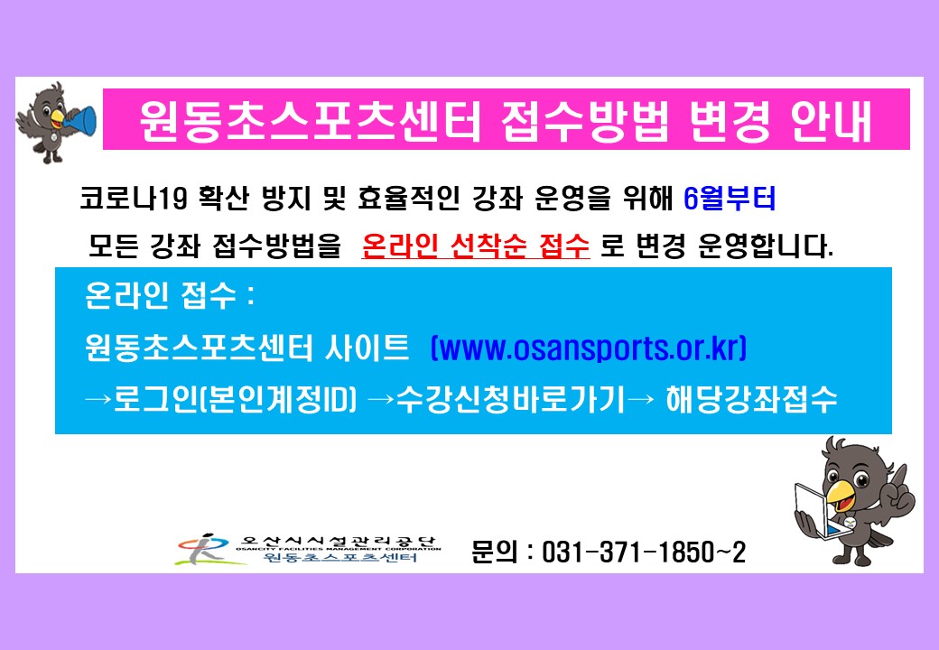 원동초 스포츠센터 [원동]접수방법 안내 작성자 osansisul02 등록일자 2022년 6월 27일 8시 46분 49초 조회 3,377 온라인접수 홍보.jpg [ Size : 133.68KB , Down : 5,042 ] 미리보기 다운로드 목록보기