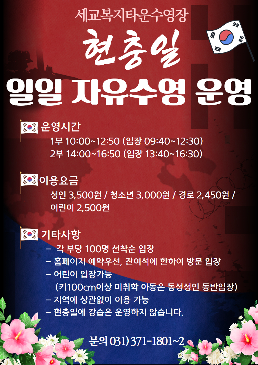 세교복지타운 수영장 [세교]현충일 운영안내 작성자 osansisul01 등록일자 2024년 6월 3일 15시 26분 21초 조회 711 현충일 자유수영.jpg [ Size : 1.21MB , Down : 1,081 ] 미리보기 다운로드 목록보기