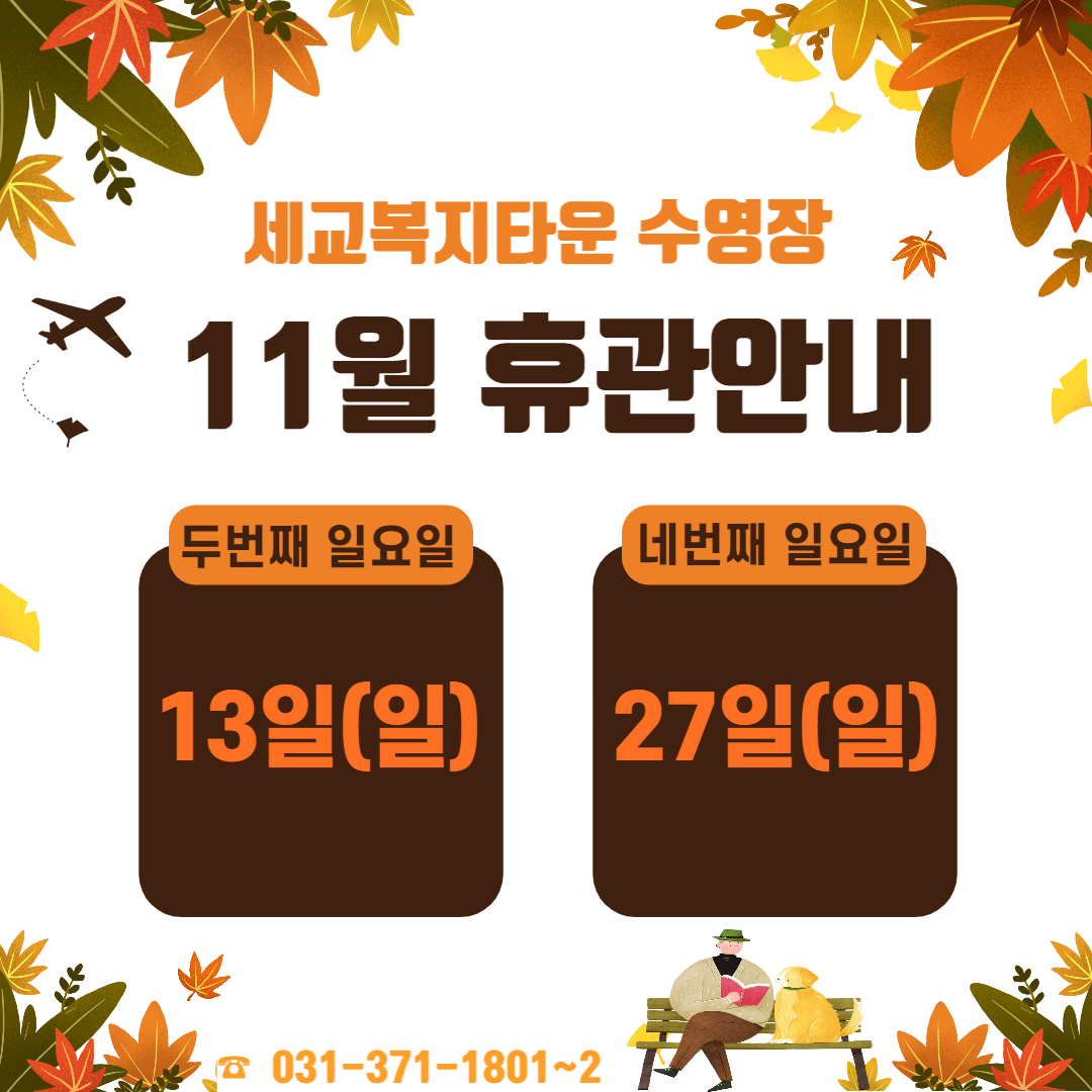 세교복지타운 수영장 11월 휴관일 안내 작성자 osansisul01 등록일자 2022년 10월 25일 14시 53분 41초 조회 285 11월 휴관(웹용).jpg [ Size : 593.35KB , Down : 278 ] 미리보기 다운로드 목록보기