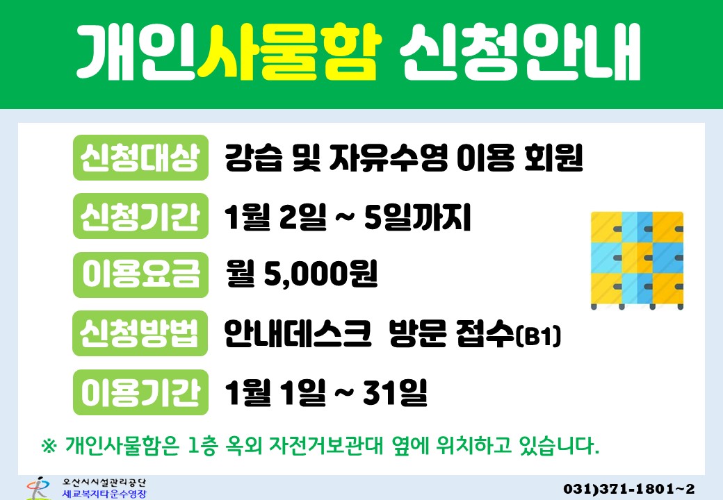 세교복지타운 수영장 1월 개인사물함 신청 안내 작성자 osansisul01 등록일자 2024년 1월 2일 20시 29분 16초 조회 295 1월 개인사물함.jpg [ Size : 134.51KB , Down : 738 ] 미리보기 다운로드 목록보기