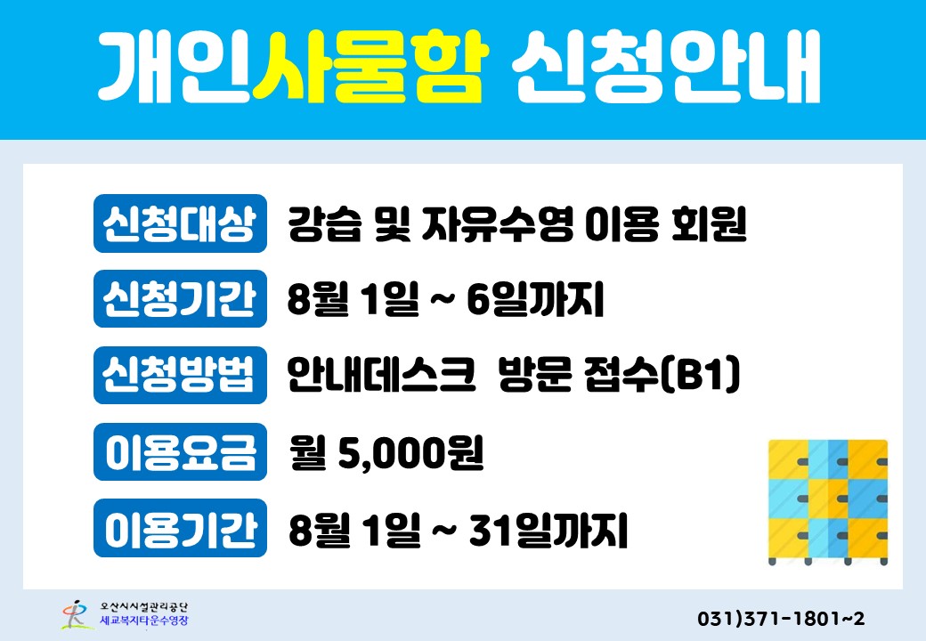 세교복지타운 수영장 8월 개인사물함 신청 안내 작성자 osansisul01 등록일자 2022년 8월 1일 13시 51분 15초 조회 242 8월 사물함 신청 안내.jpg [ Size : 127.51KB , Down : 277 ] 미리보기 다운로드 목록보기