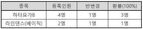하타요가B, ,라인댄스(베이직) 강습반은 등록인원 저조로 폐강하였으며,