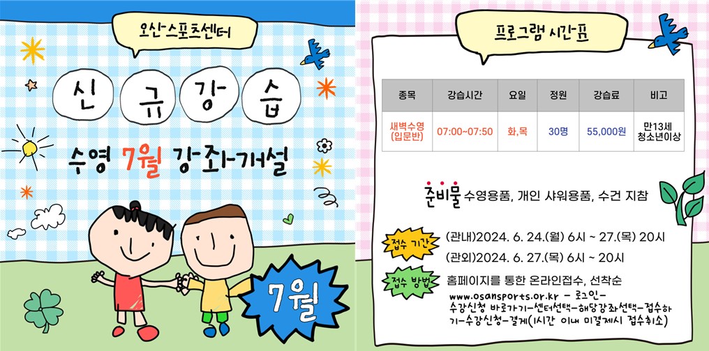 오산스포츠센터 (센터) 오산스포츠센터 7월 수영 신규강습 개설안내 작성자 osansisul03 등록일자 2024년 6월 17일 15시 19분 27초 조회 2,222 7월 신규반 안내.jpg [ Size : 160.21KB , Down : 3,561 ] 미리보기 다운로드 목록보기