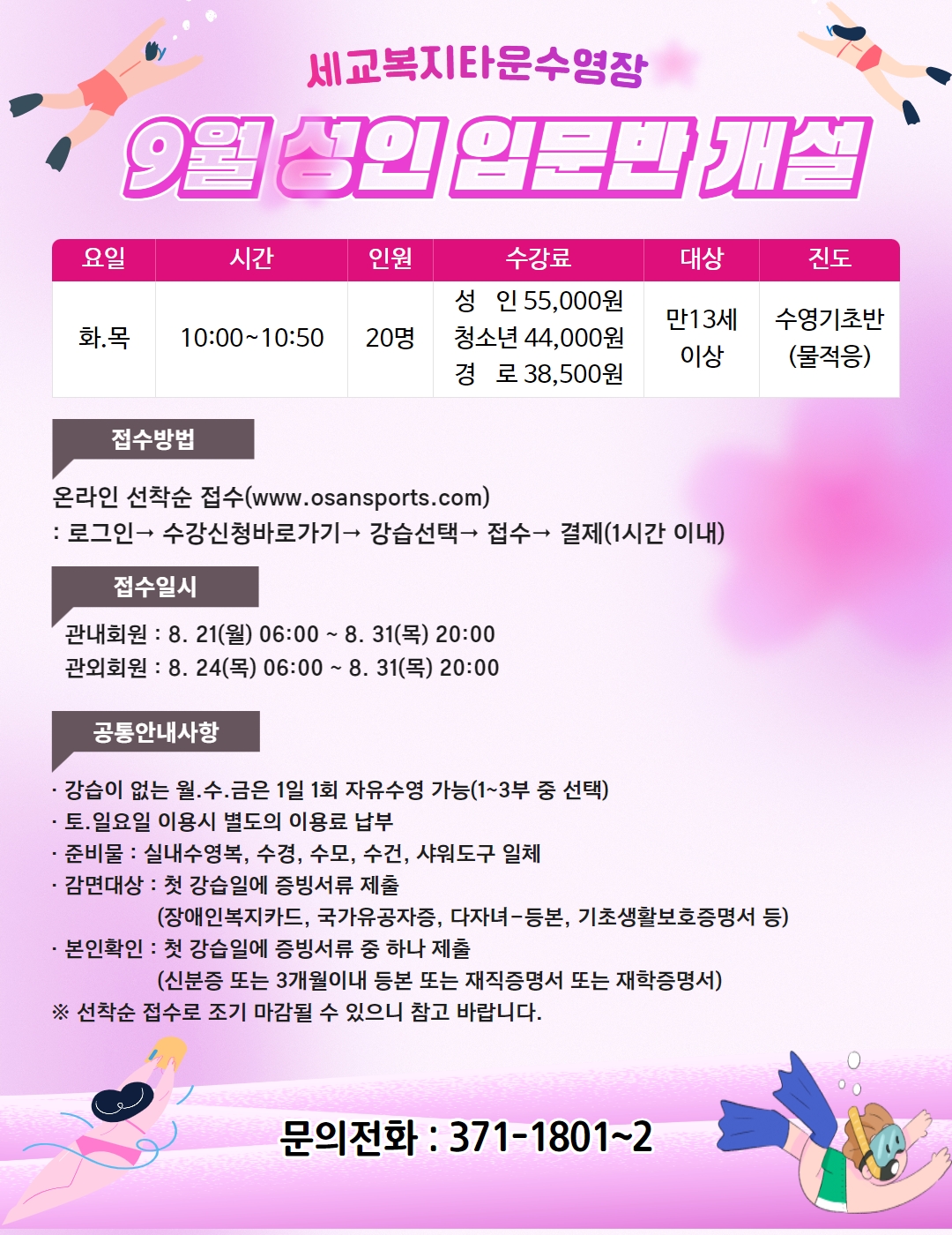 세교복지타운 수영장 9월 성인 입문반 개설 안내 작성자 osansisul01 등록일자 2023년 8월 16일 10시 17분 50초 조회 3,439 9월 입문반 (1).jpg [ Size : 929.32KB , Down : 5,586 ] 미리보기 다운로드 목록보기