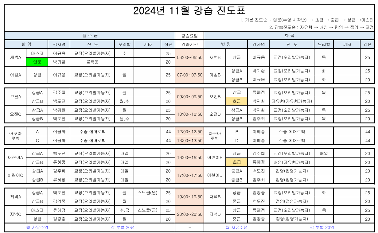 원동초 스포츠센터 [원동]11월 수영강습 진도표 작성자 osansisul02 등록일자 2024년 10월 15일 10시 38분 51초 조회 974 11월강습진도표.png [ Size : 178.39KB , Down : 1,375 ] 미리보기 다운로드 목록보기