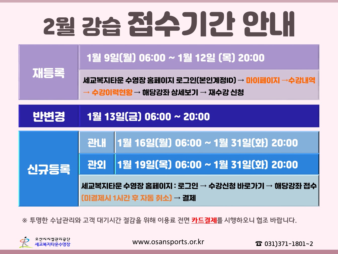 세교복지타운 수영장 2월 강습 접수기간 안내 작성자 osansisul01 등록일자 2023년 1월 6일 12시 59분 14초 조회 516 23.2월 접수기간 안내.jpg [ Size : 223.54KB , Down : 701 ] 미리보기 다운로드 목록보기