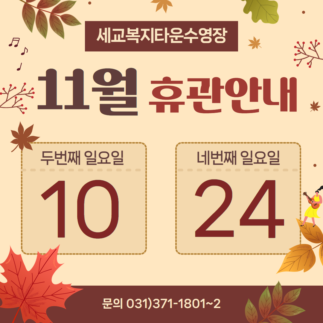 세교복지타운 수영장 [세교] 11월 휴관 안내 작성자 osansisul01 등록일자 2024년 10월 23일 14시 2분 59초 조회 340 11월 휴관안내.jpg [ Size : 487.73KB , Down : 418 ] 미리보기 다운로드 목록보기