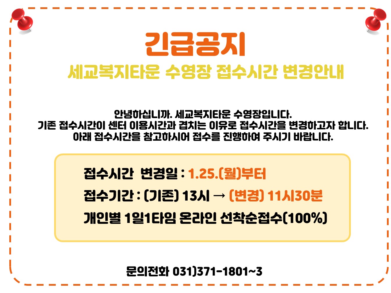 세교복지타운 수영장 긴급공지)접수시간 변경 안내 작성자 세교센터관리자 등록일자 2021년 1월 22일 18시 8분 51초 조회 610 긴급공지 안내.jpg [ Size : 191.54KB , Down : 313 ] 미리보기 다운로드 목록보기