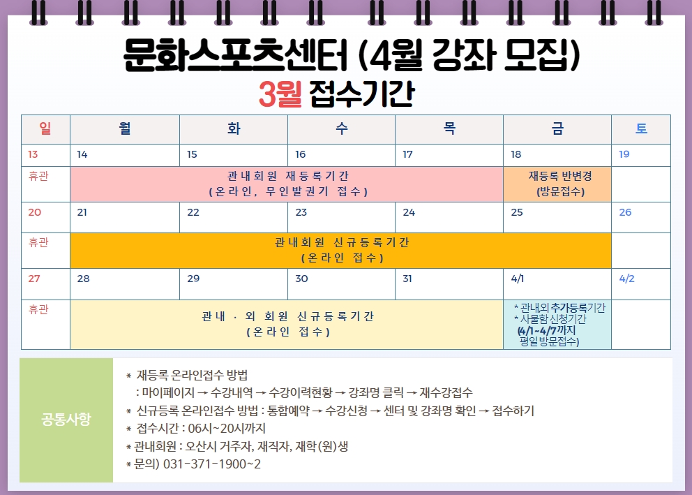 오색문화체육센터 오산문화스포츠센터 3월 접수기간(2022. 4월 강좌) 작성자 허슬기 등록일자 2022년 3월 10일 19시 8분 15초 조회 725 3월 접수기간(4월강좌).jpg [ Size : 261.99KB , Down : 364 ] 미리보기 다운로드 목록보기