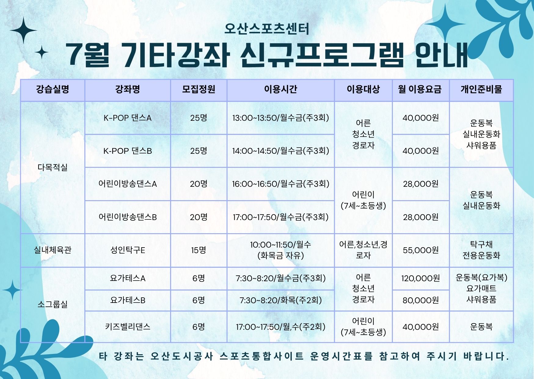 오산스포츠센터 오산스포츠센터 7월 스포츠강좌 신규 프로그램 안내 작성자 osansisul03 등록일자 2025년 6월 9일 13시 19분 28초 조회 2,150 20250609 오산스포츠센터 스포츠강좌 프로그램 안내_재홍보.jpg [ Size : 313.31KB , Down : 2,786 ] 미리보기 다운로드 목록보기