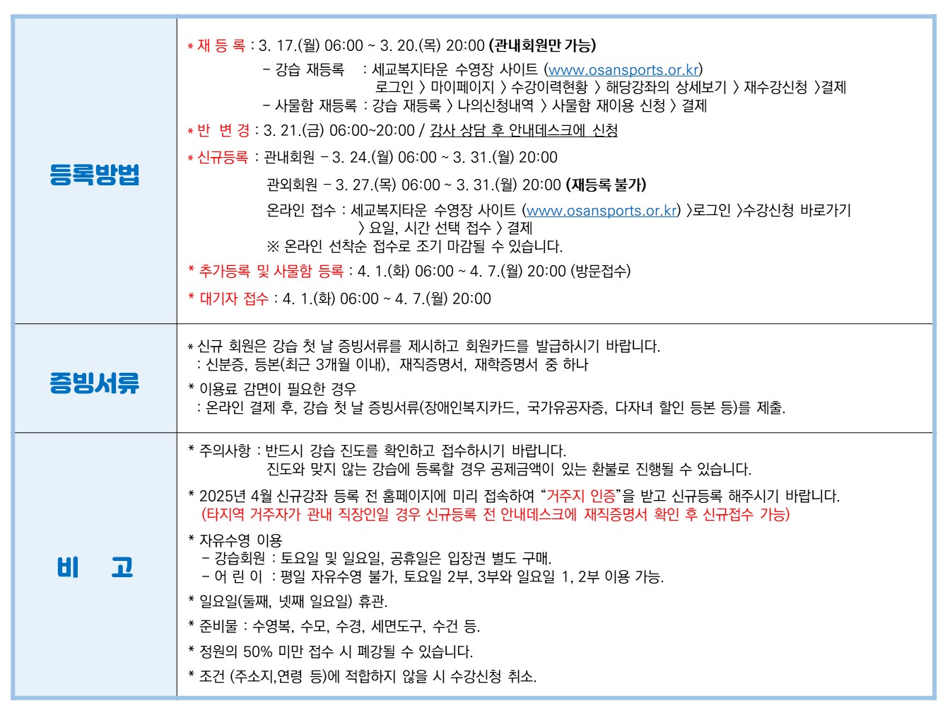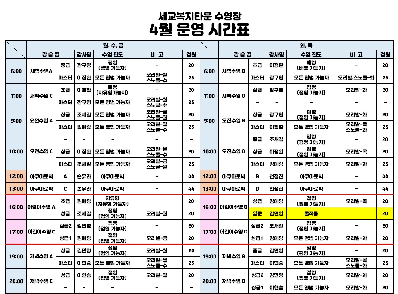 세교복지타운 수영장 [세교] 4월 강습진도표 작성자 osansisul01 등록일자 2025년 3월 10일 10시 46분 35초 조회 1,128 4월 강습진도표1-홈피.jpg [ Size : 391.42KB , Down : 1,896 ] 미리보기 다운로드 4월 강습진도표2-홈피.jpg [ Size : 275.13KB , Down : 1,678 ] 미리보기 다운로드 목록보기