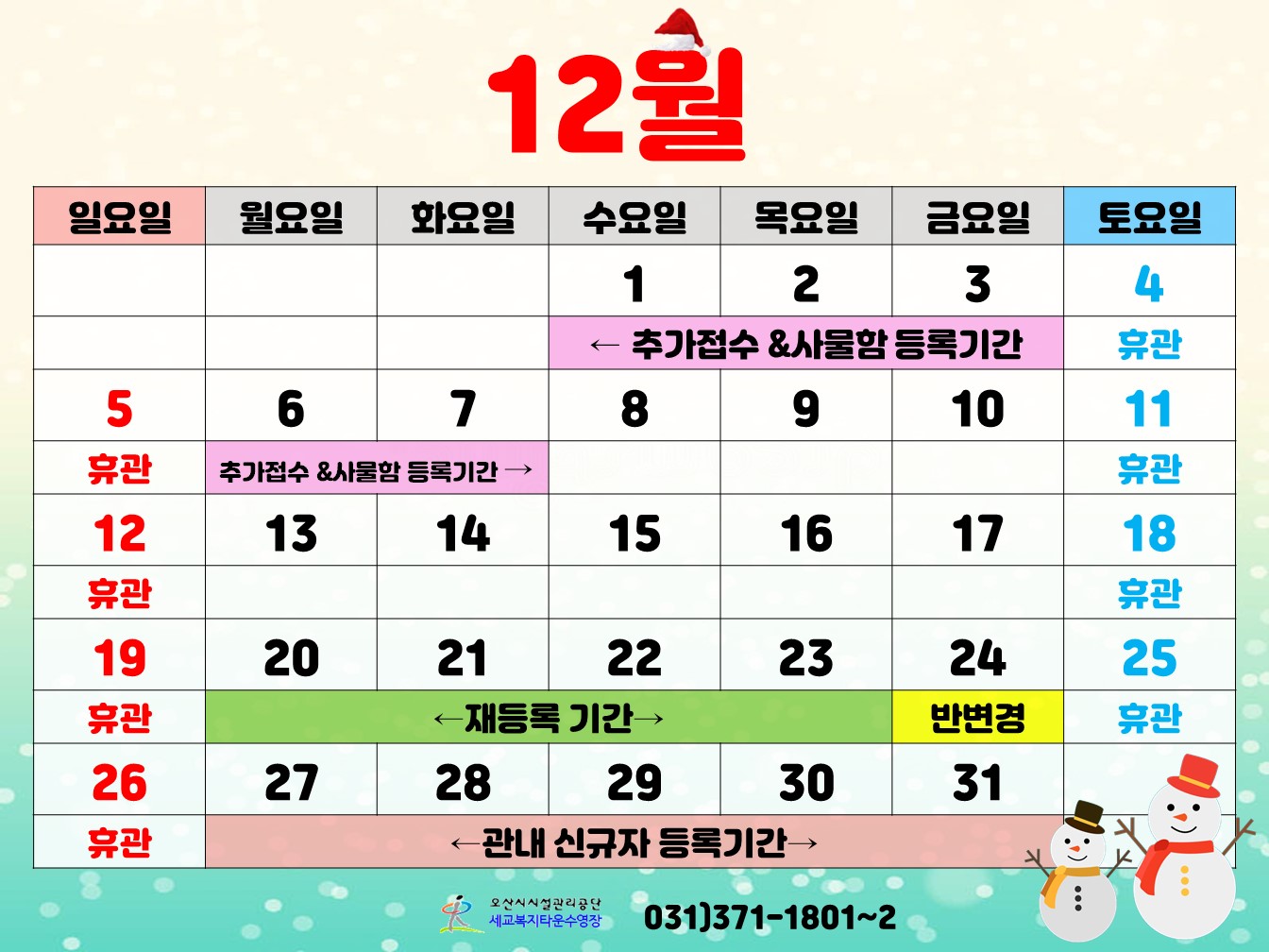 세교복지타운 수영장 12월 일정표 (접수기간 및 휴관일 안내) 작성자 osansisul01 등록일자 2021년 12월 9일 15시 46분 24초 조회 380 12월 접수기간 및 휴관일 달력.jpg [ Size : 217.2KB , Down : 173 ] 미리보기 다운로드 목록보기