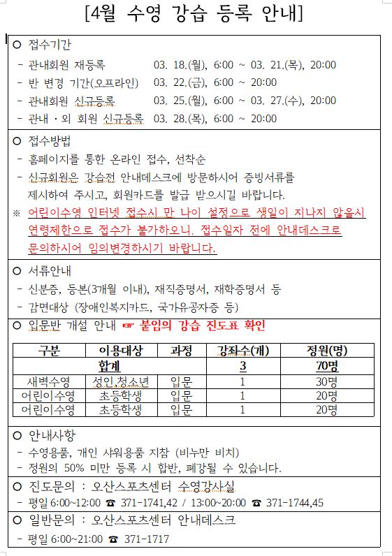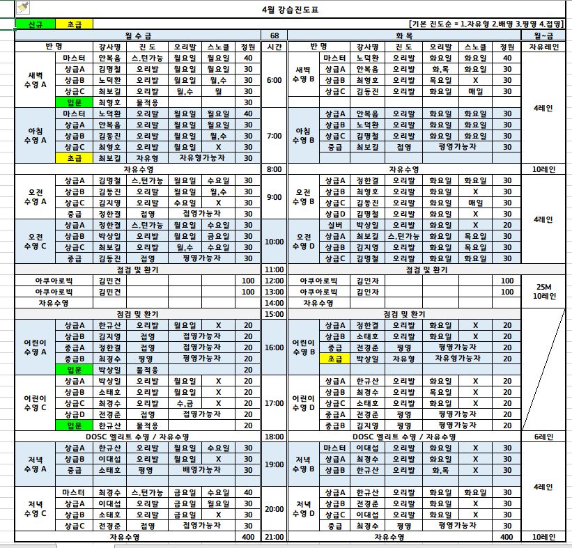 오산스포츠센터 오산스포츠센터 4월 수영강습 등록 안내 작성자 osansisul03 등록일자 2024년 3월 15일 14시 51분 36초 조회 3,876 4월 강습등록 안내.JPG [ Size : 108.22KB , Down : 7,132 ] 미리보기 다운로드 4월 강습진도표.JPG [ Size : 223.45KB , Down : 7,612 ] 미리보기 다운로드 2024년 4월 수영 강습시간표.xlsx [ Size : 22.42KB , Down : 1,331 ] 다운로드 목록보기