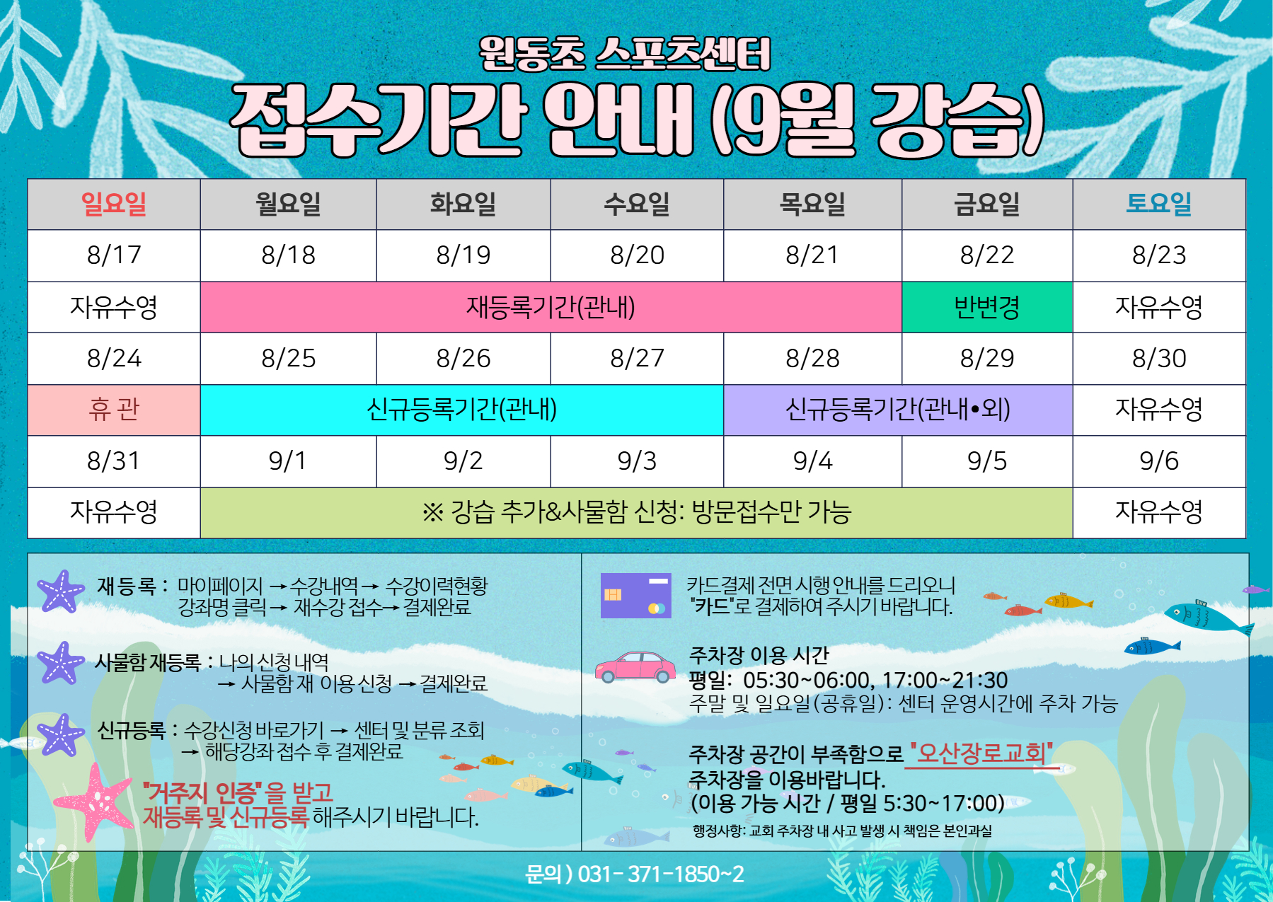 원동초 스포츠센터 [원동] 9월 강습 접수기간 안내 및 강습 진도표 (25.8.28. 강사명 수정) 작성자 osansisul02 등록일자 2025년 8월 8일 11시 54분 52초 조회 1,143 9월_접수기간안내_원동.jpg [ Size : 2.12MB , Down : 1,927 ] 미리보기 다운로드 9월 강습진도표_원동_수정본.jpg [ Size : 230.46KB , Down : 502 ] 미리보기 다운로드 목록보기