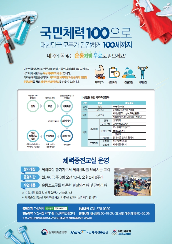 공통 체력증진교실 운영 안내(오산 체력인증센터) 작성자 최고관리자 등록일자 2019년 6월 12일 13시 5분 32초 조회 453 국민체력100 오산체력인증센터 홍보콘텐츠.jpg [ Size : 406.34KB , Down : 269 ] 미리보기 다운로드 목록보기