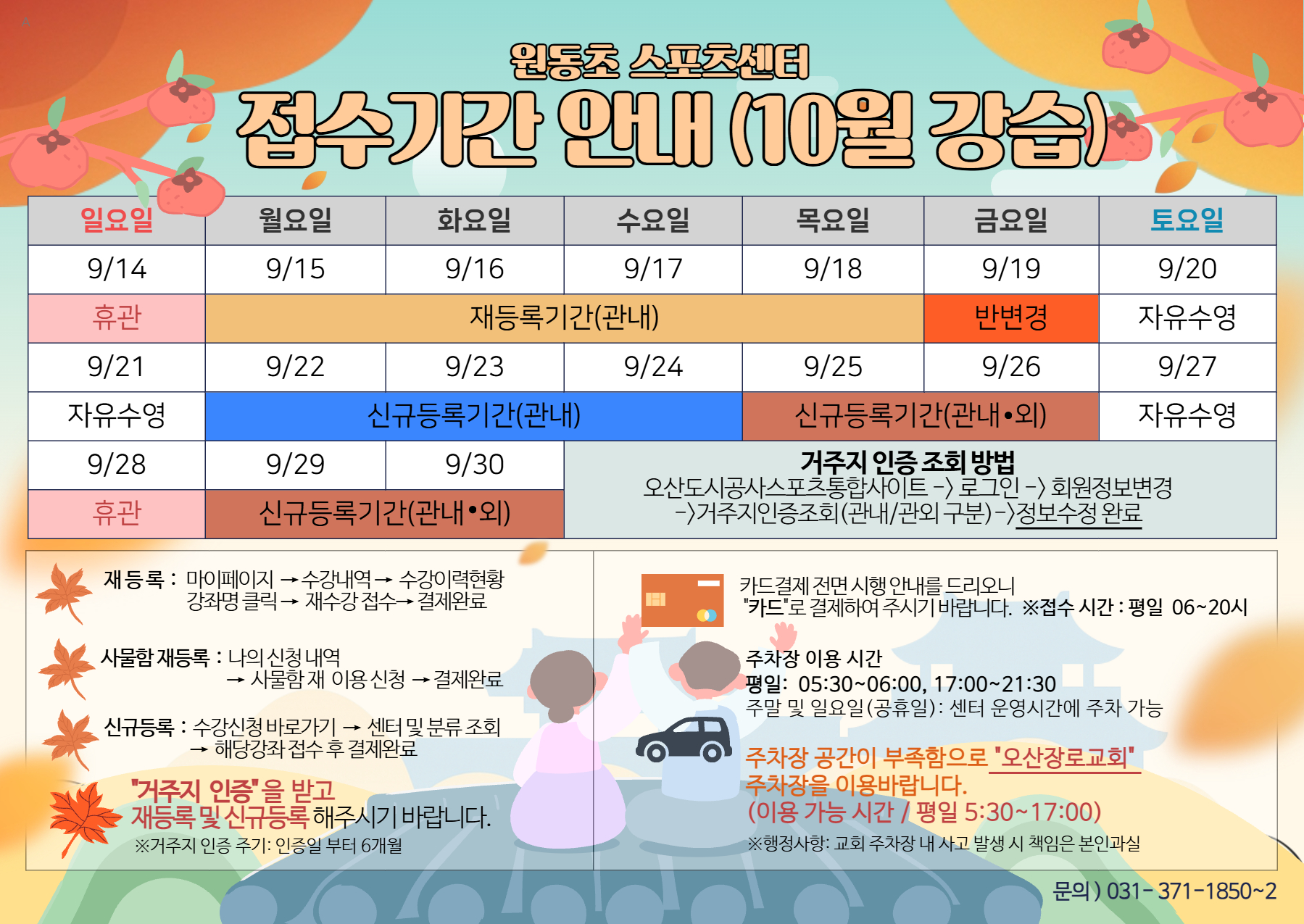 원동초 스포츠센터 [원동] 10월 강습 접수기간 안내 작성자 osansisul02 등록일자 2025년 9월 11일 14시 23분 55초 조회 579 10월_접수기간안내_원동.jpg [ Size : 1.35MB , Down : 860 ] 미리보기 다운로드 목록보기