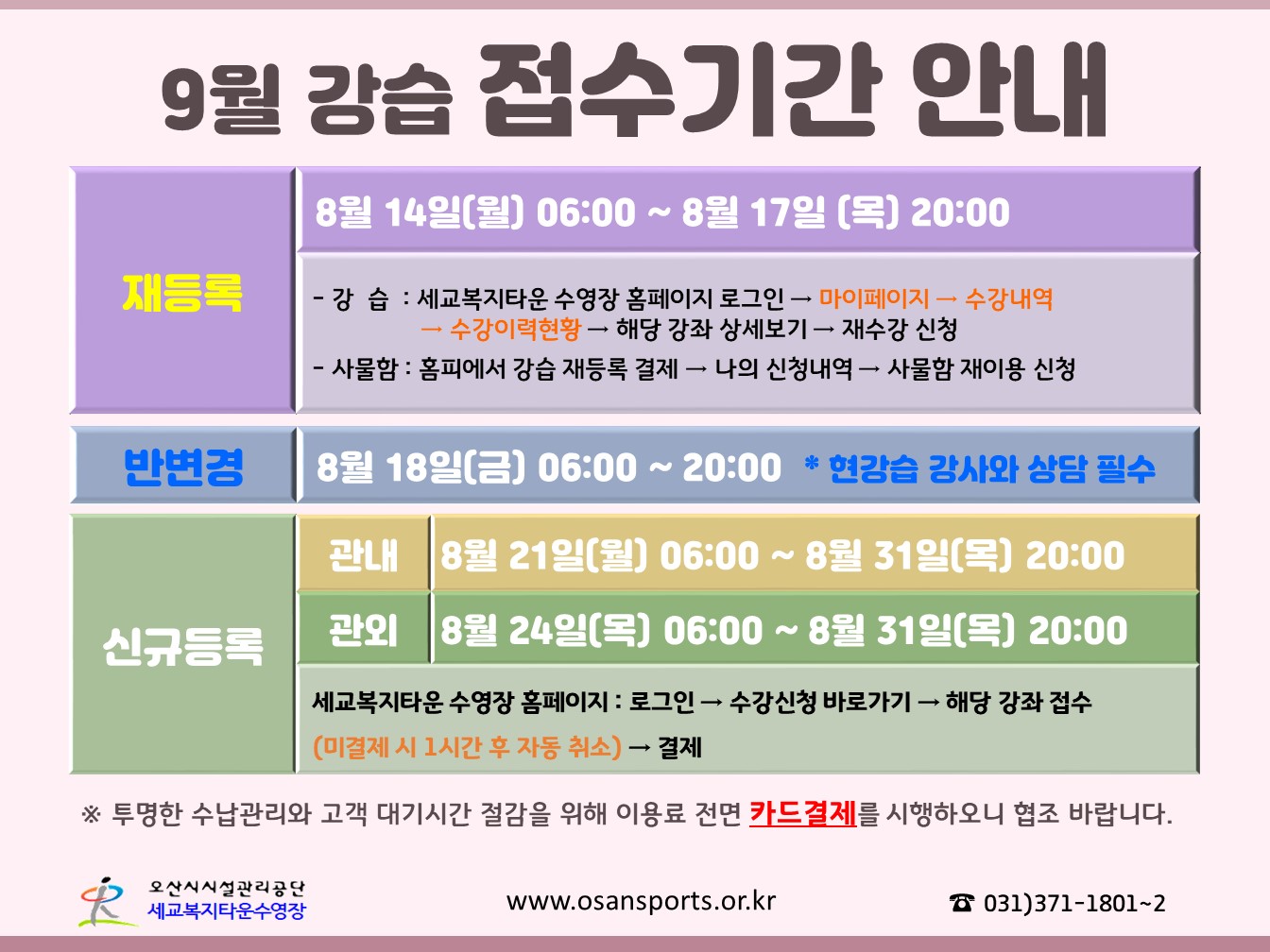 세교복지타운 수영장 9월 강습 접수기간 안내 작성자 osansisul01 등록일자 2023년 8월 2일 14시 27분 24초 조회 1,522 23.9월강습 접수기간 안내.jpg [ Size : 221.23KB , Down : 2,869 ] 미리보기 다운로드 목록보기