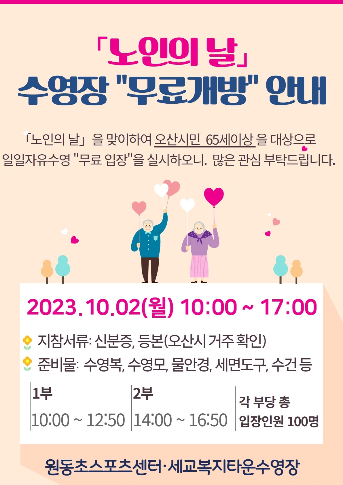 세교복지타운 수영장 노인의 날 " 수영장 무료 개방" 작성자 osansisul01 등록일자 2023년 9월 12일 9시 45분 12초 조회 584 노인의날_홍보문(원동,세교).jpg [ Size : 483.23KB , Down : 1,075 ] 미리보기 다운로드 목록보기