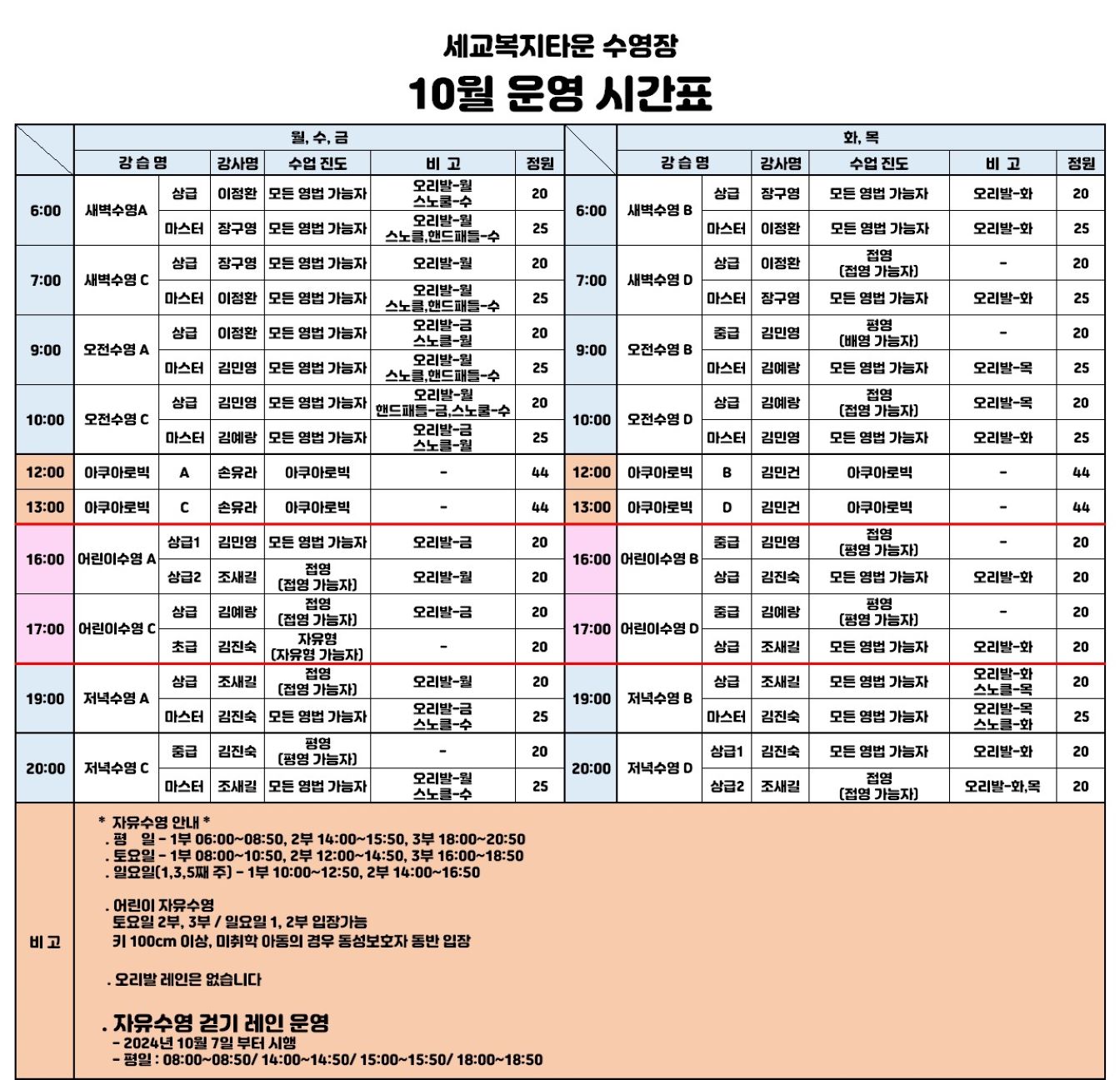세교복지타운 수영장 [세교] 10월 강습 진도표 작성자 osansisul01 등록일자 2024년 9월 5일 20시 10분 26초 조회 1,417 10월 강습진도표1(크기조정).jpg [ Size : 303.87KB , Down : 2,003 ] 미리보기 다운로드 24.10월 수영 접수 안내문.jpg [ Size : 246.76KB , Down : 1,819 ] 미리보기 다운로드 목록보기