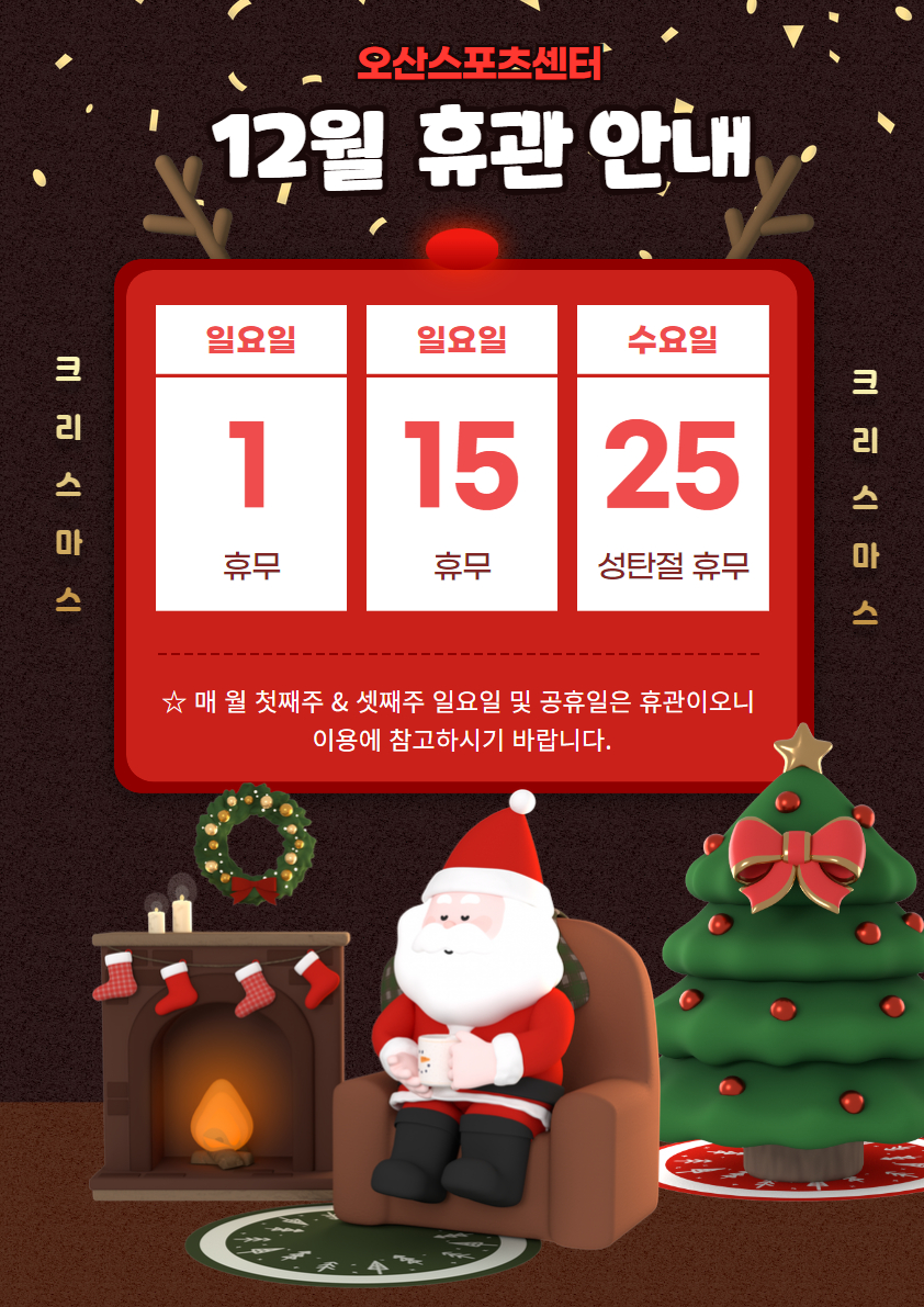 오산스포츠센터 2024년 12월 오산스포츠센터 휴관안내 작성자 osansisul03 등록일자 2024년 11월 16일 10시 40분 42초 조회 3,470 2024. 12월.jpg [ Size : 859.18KB , Down : 4,383 ] 미리보기 다운로드 목록보기