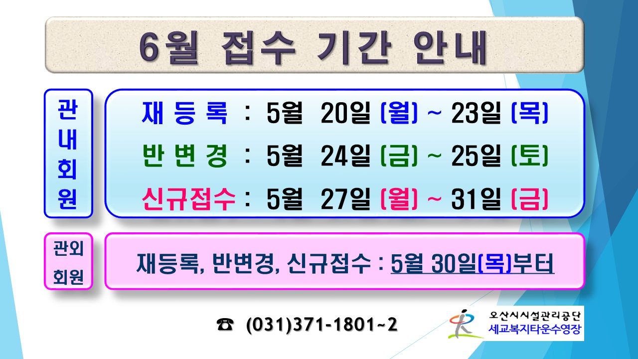세교복지타운 수영장 6월 접수기간 안내 작성자 세교센터관리자 등록일자 2019년 5월 10일 20시 9분 15초 조회 676 5월 접수기간.jpg [ Size : 175.07KB , Down : 132 ] 미리보기 다운로드 목록보기