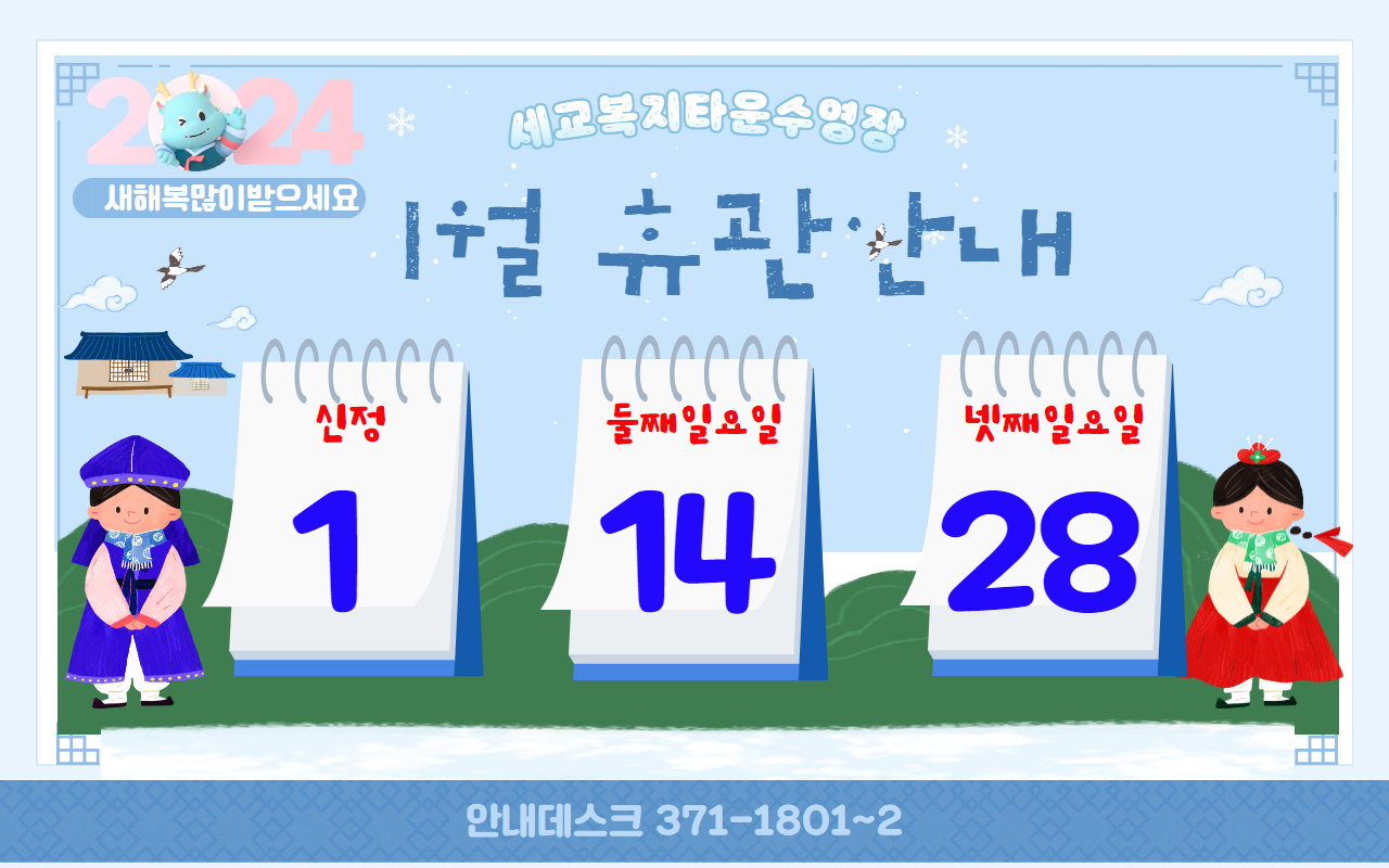 세교복지타운 수영장 24년 1월 휴관일 안내 작성자 osansisul01 등록일자 2023년 12월 26일 19시 20분 28초 조회 1,472 1월휴관일.jpg [ Size : 614.68KB , Down : 2,441 ] 미리보기 다운로드 목록보기