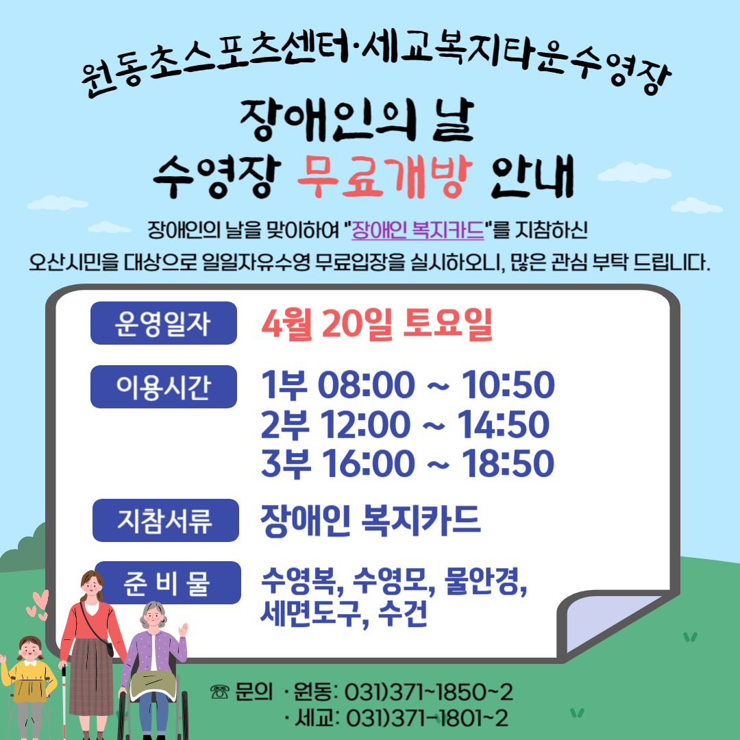 세교복지타운 수영장 [원동, 세교] 장애인의날 수영장 무료개방 안내 작성자 osansisul01 등록일자 2024년 4월 15일 13시 29분 34초 조회 376 장애인의날 무료개방.jpg [ Size : 584.6KB , Down : 581 ] 미리보기 다운로드 목록보기