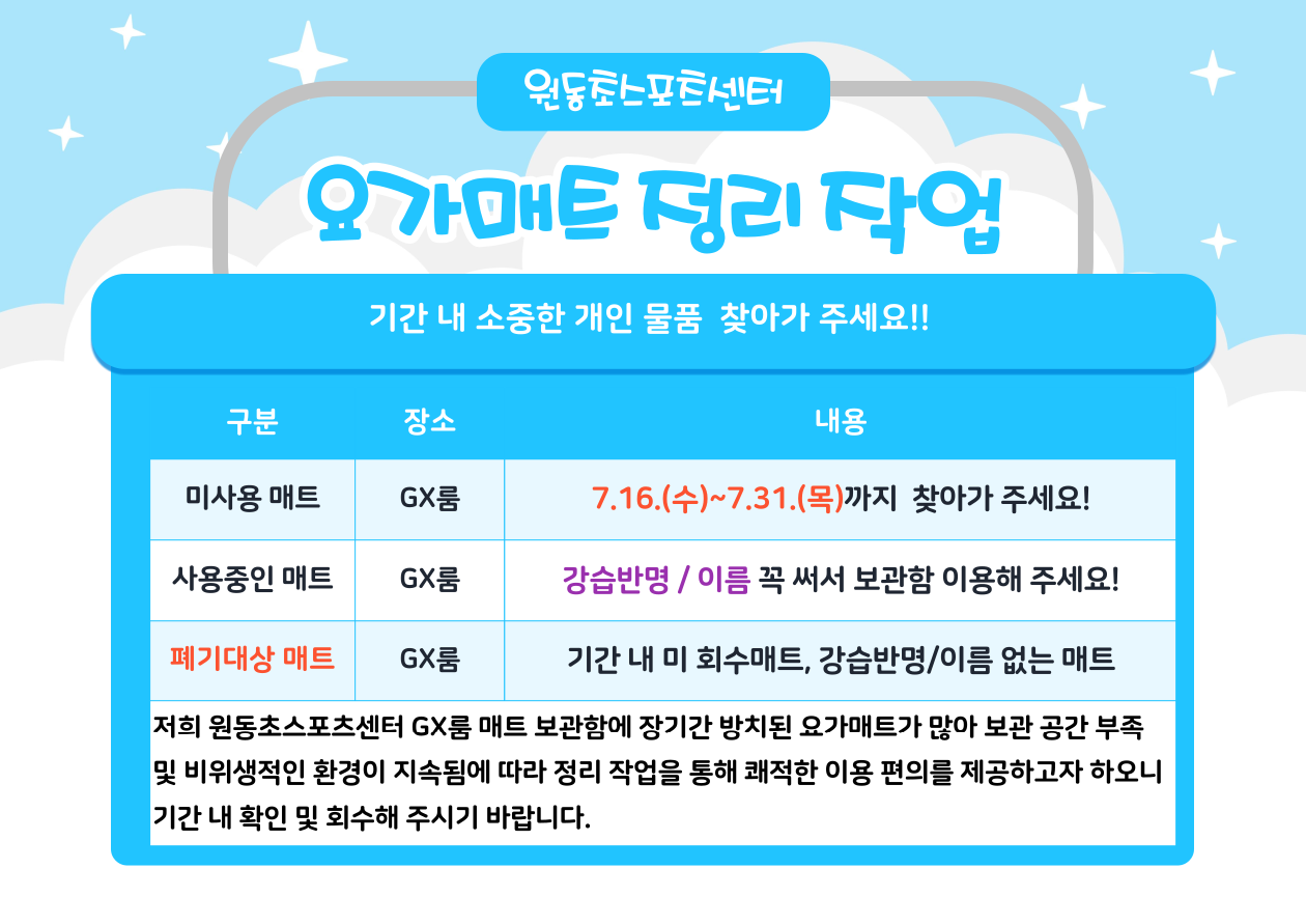 원동초 스포츠센터 [원동] 요가매트 정리작업 안내