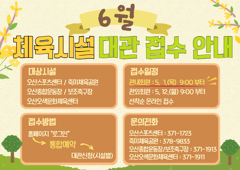 공통 6월 시설대관 접수 안내 작성자 osansisul04 등록일자 2025년 4월 14일 16시 45분 4초 조회 473 . 체육시설6월대관안내.jpg [ Size : 660.37KB , Down : 512 ] 미리보기 다운로드 목록보기