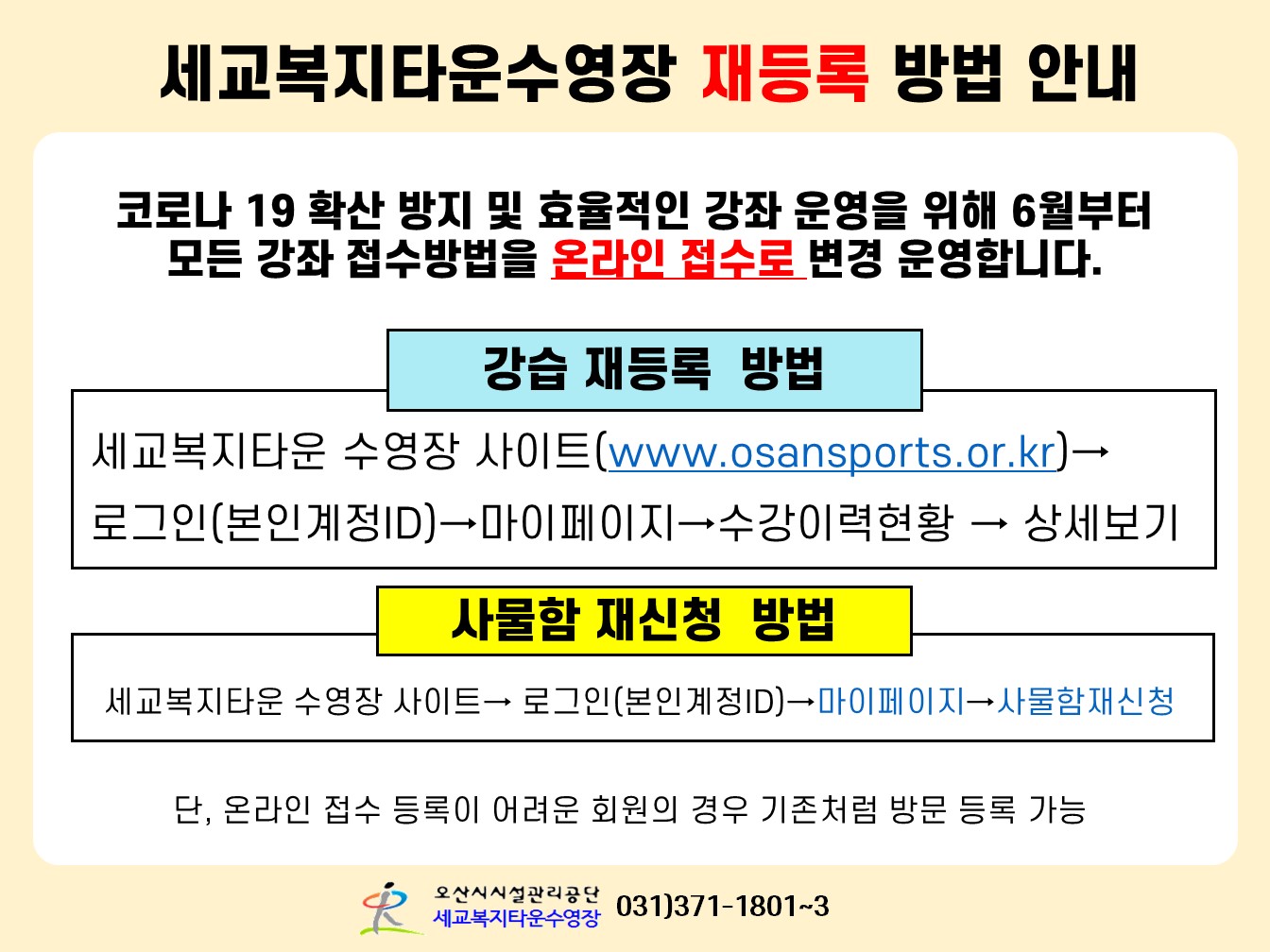 세교복지타운 수영장 온라인 접수방법 안내 작성자 세교센터관리자 등록일자 2020년 5월 16일 14시 32분 15초 조회 450 접수방법 안내 -5월 18일.jpg [ Size : 230.73KB , Down : 132 ] 미리보기 다운로드 목록보기