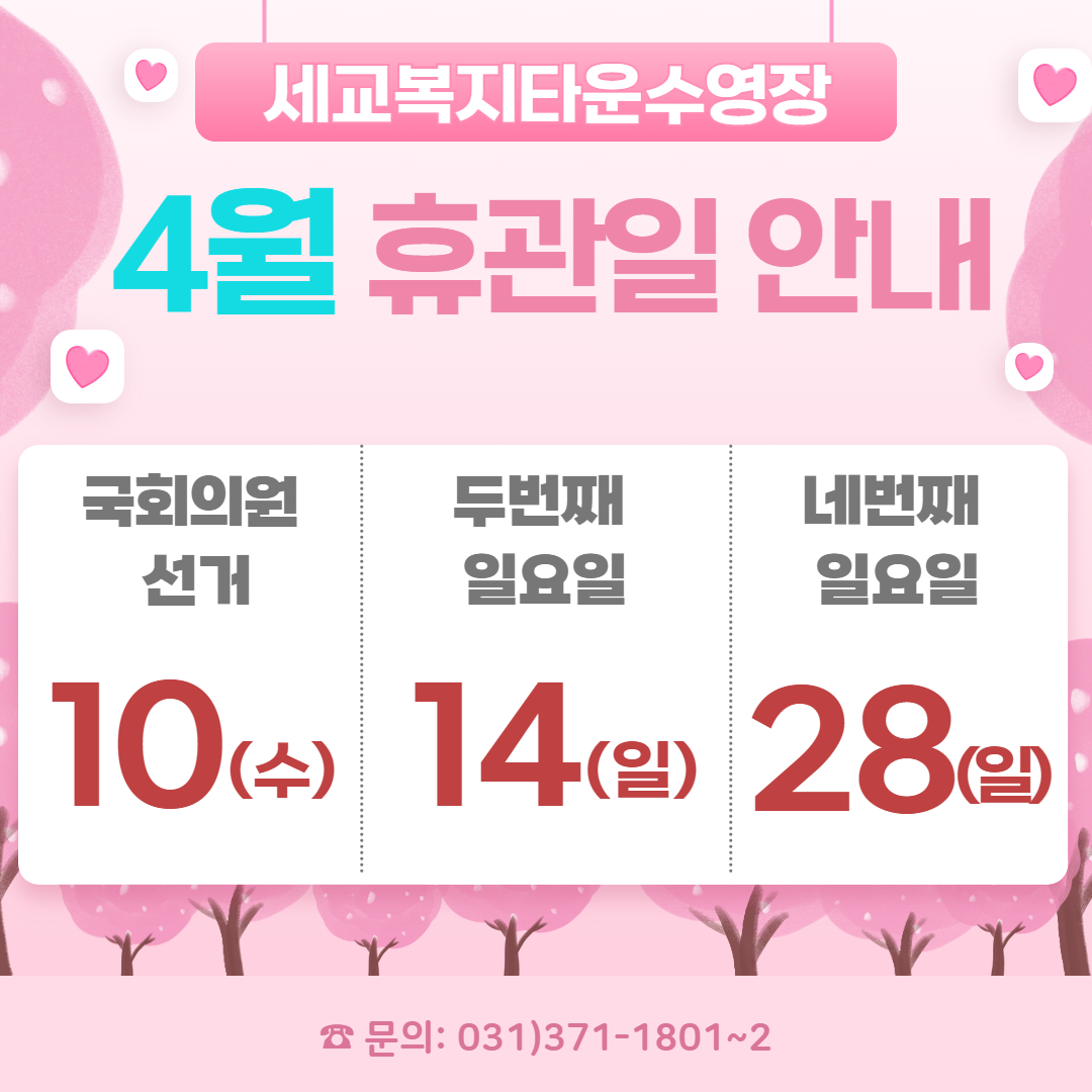 세교복지타운 수영장 [세교] 4월 휴관안내 작성자 osansisul01 등록일자 2024년 3월 25일 11시 22분 24초 조회 999 4월 휴관일.jpg [ Size : 461.66KB , Down : 1,681 ] 미리보기 다운로드 목록보기