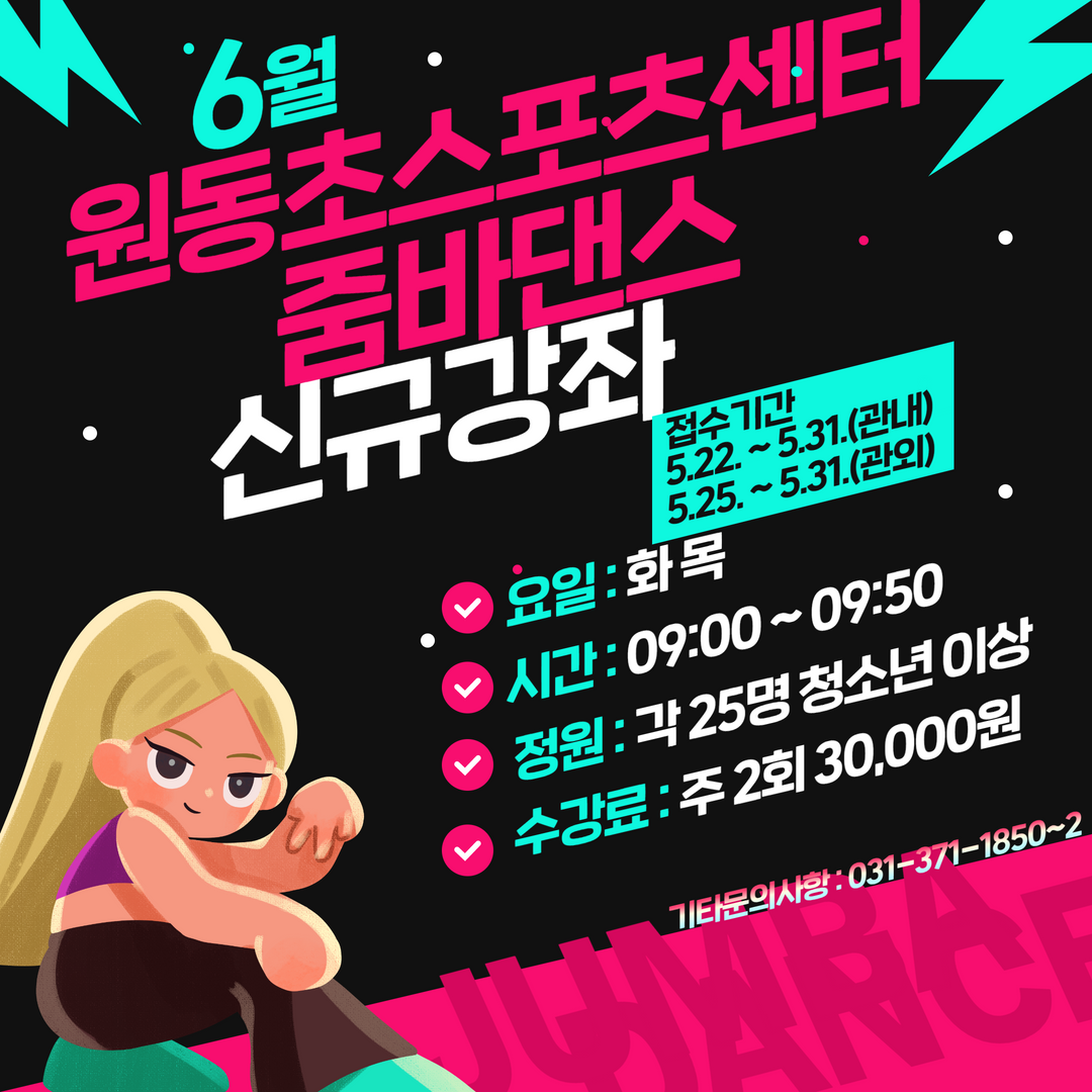 원동초 스포츠센터 6월 신규강좌 개설 안내(줌바댄스) 작성자 osansisul02 등록일자 2023년 5월 12일 10시 35분 36초 조회 378 줌바댄스.png [ Size : 558.71KB , Down : 408 ] 미리보기 다운로드 목록보기