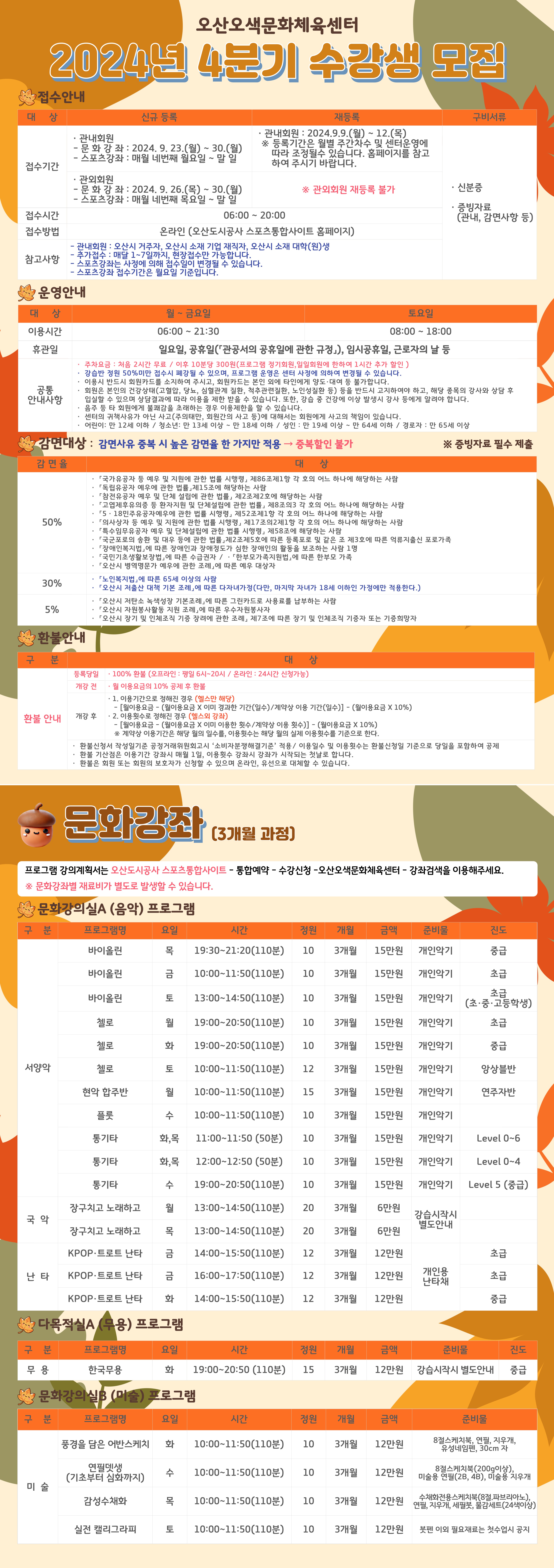 오색문화체육센터 [오색문화] 2024년 4분기 회원 모집 안내 작성자 osansisul04 등록일자 2024년 9월 9일 14시 16분 49초 조회 1,761 . 1페이지.jpg [ Size : 4.17MB , Down : 1,966 ] 미리보기 다운로드 2페이지.jpg [ Size : 3.69MB , Down : 1,958 ] 미리보기 다운로드 목록보기