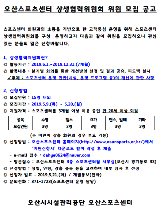 오산스포츠센터 오산스포츠센터 상생협력위원회 위원 모집 공고 작성자 최고관리자 등록일자 2019년 5월 9일 11시 5분 22초 조회 429 상생협력위원회 위원.PNG [ Size : 114.93KB , Down : 164 ] 미리보기 다운로드 오산스포츠센터 상생협력위원회 지원 신청서.hwp [ Size : 13.5KB , Down : 364 ] 다운로드 목록보기