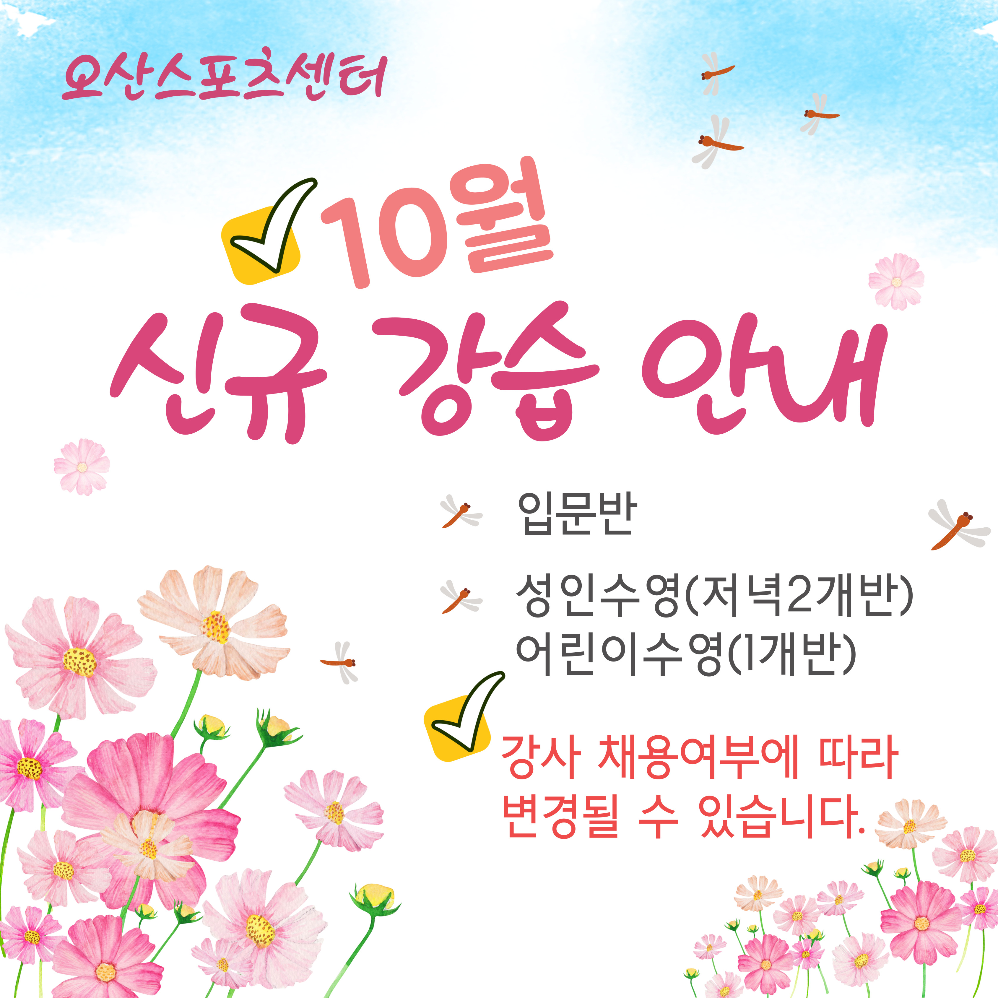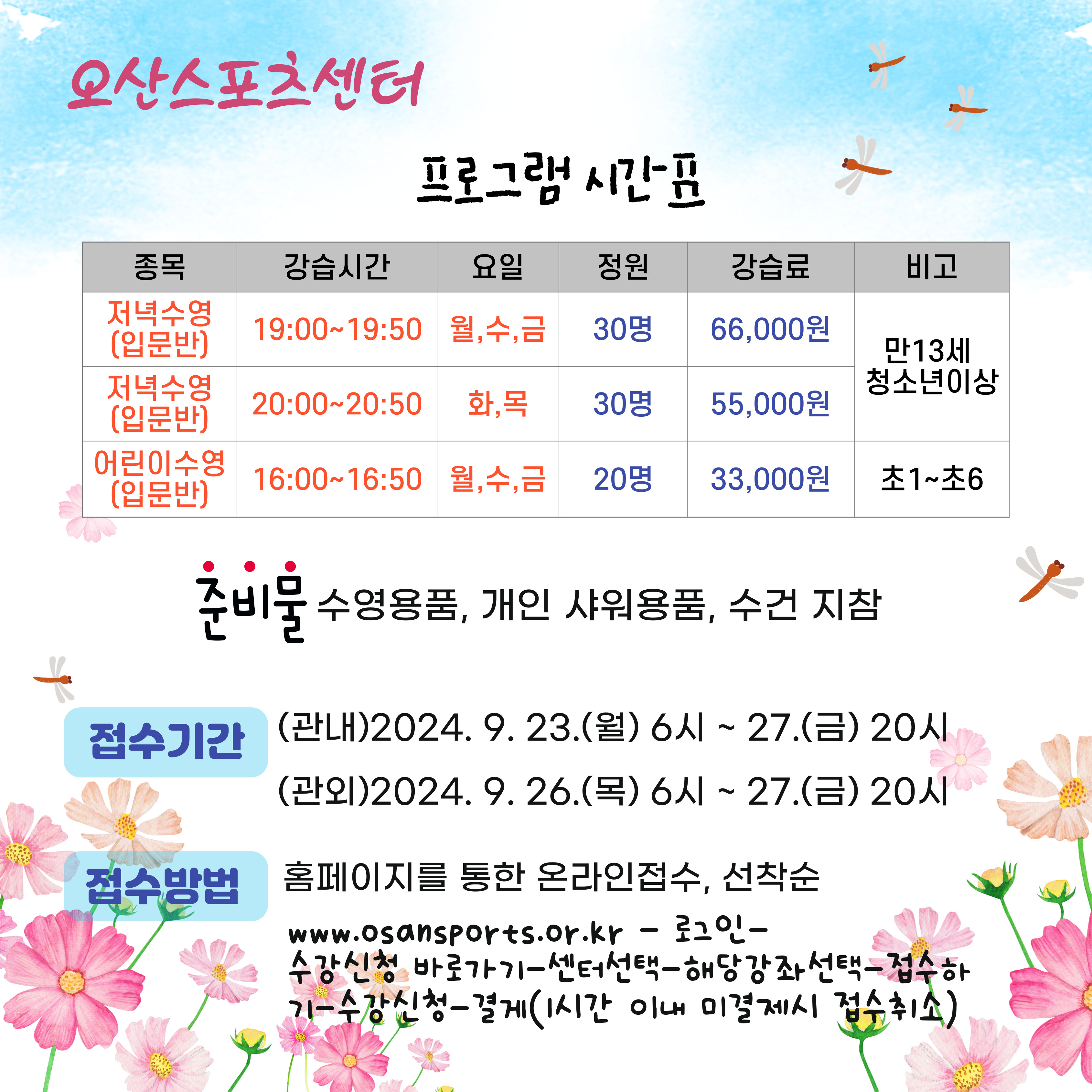 오산스포츠센터 2024년 오산스포츠센터 10월 수영 신규강좌 개설 안내 작성자 osansisul03 등록일자 2024년 9월 11일 15시 45분 35초 조회 4,597 001.jpg [ Size : 1.38MB , Down : 6,762 ] 미리보기 다운로드 001.jpg [ Size : 1.51MB , Down : 5,765 ] 미리보기 다운로드 목록보기