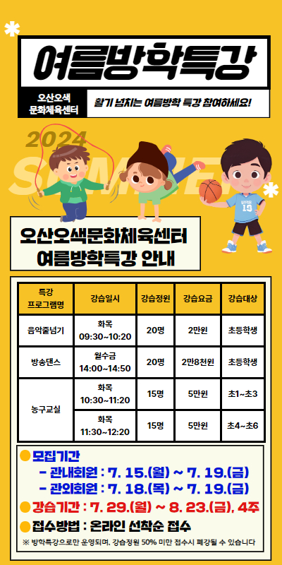 <2024년도 오산오색문화체육센터 어린이 여름방학특강 모집안내>