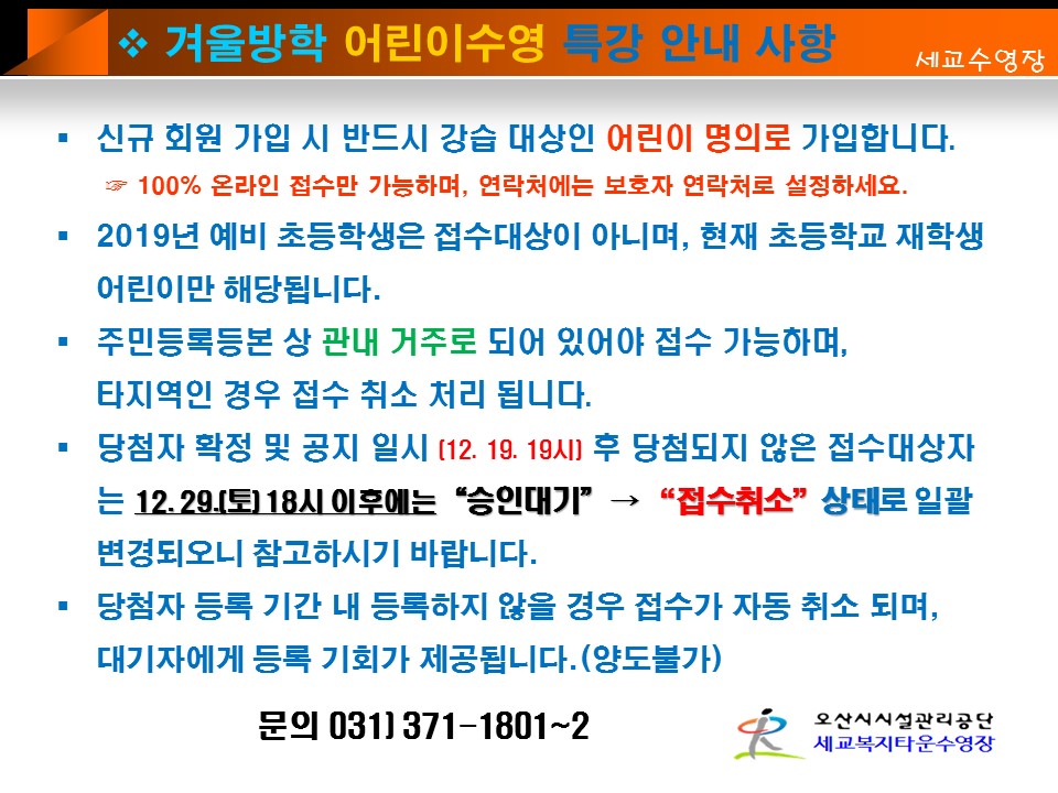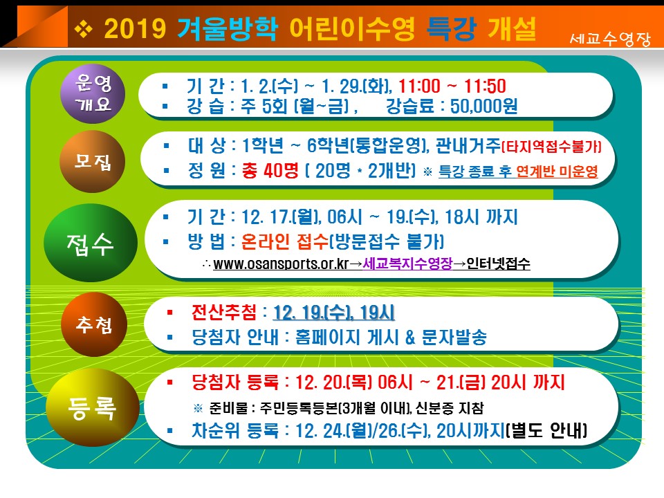 세교복지타운 수영장 2019년 겨울방학 어린이수영 특강 개설 알림 작성자 세교센터관리자 등록일자 2018년 12월 12일 9시 32분 43초 조회 629 2019년_겨울방학 특강2.jpg [ Size : 206.57KB , Down : 167 ] 미리보기 다운로드 2019년_겨울방학 특강.jpg [ Size : 184.12KB , Down : 129 ] 미리보기 다운로드 목록보기