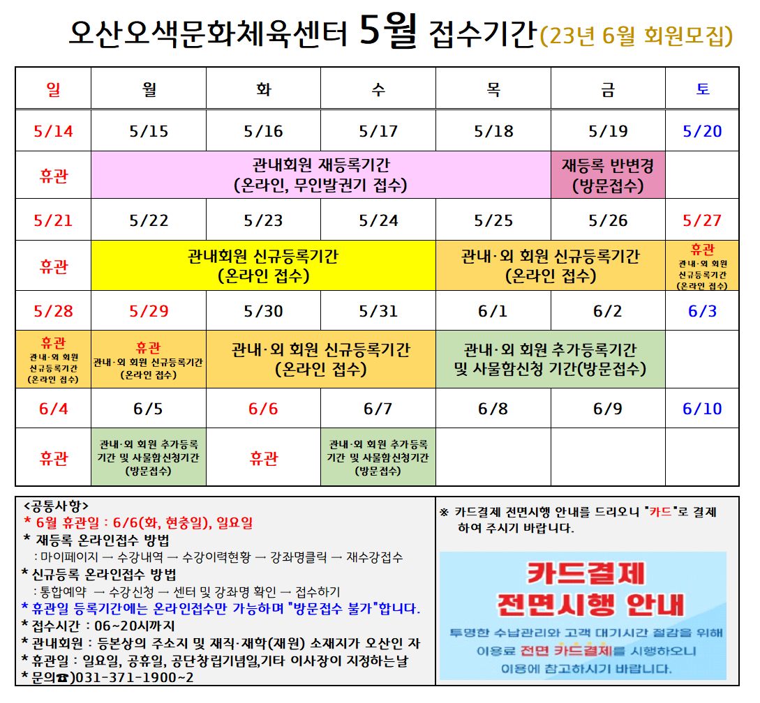 오색문화체육센터 오색문화체육센터 5월 접수기간(2023. 6월 강좌) 작성자 osansisul04 등록일자 2023년 5월 4일 11시 31분 30초 조회 713 . 2023.5월접수기간(6월강좌).png [ Size : 209.86KB , Down : 1,100 ] 미리보기 다운로드 목록보기