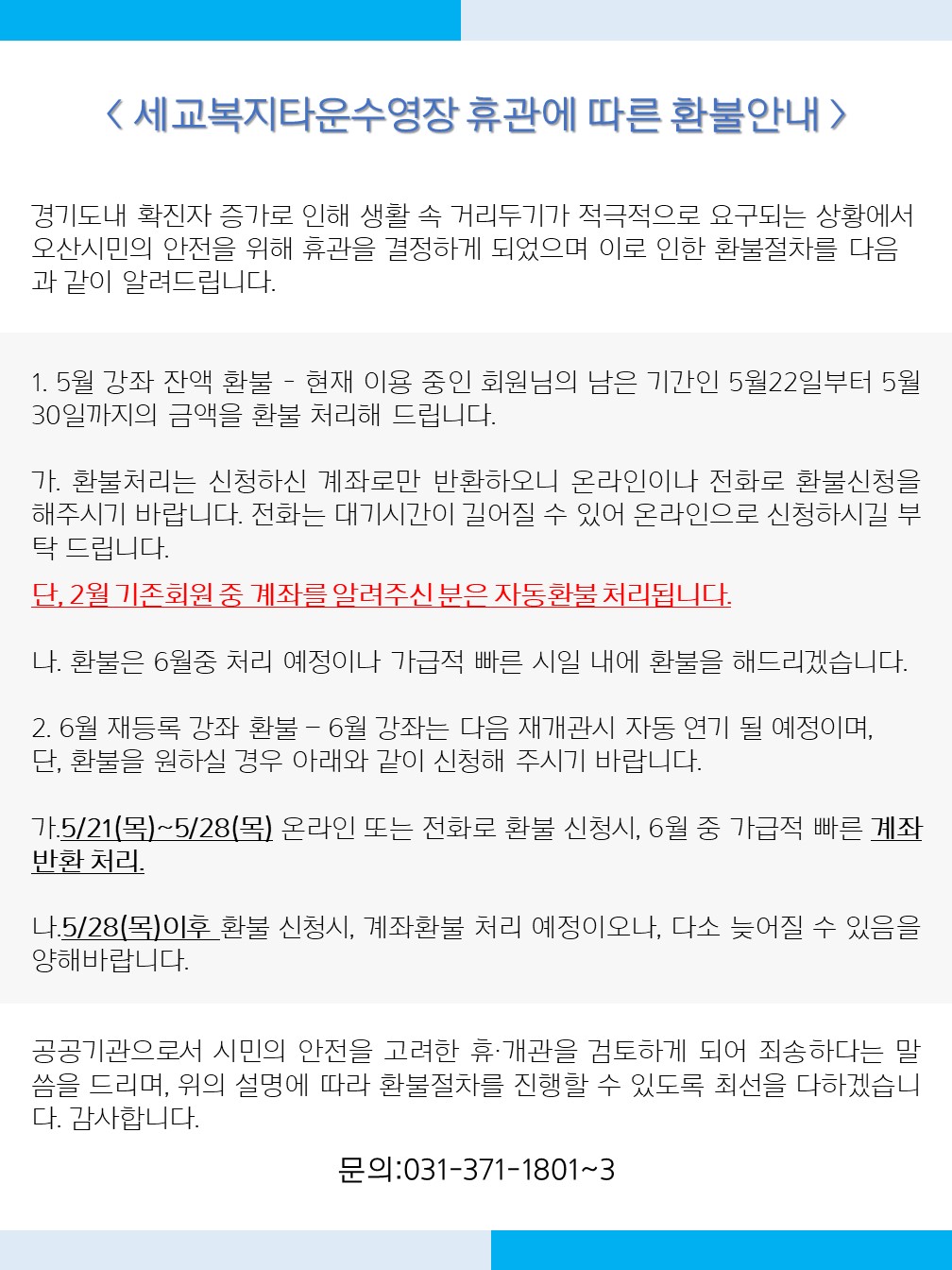 세교복지타운 수영장 세교복지타운수영장 휴관에 따른 환불 안내 작성자 세교센터관리자 등록일자 2020년 5월 22일 8시 13분 46초 조회 722 휴관에 따른 환불 안내.jpg [ Size : 242.9KB , Down : 156 ] 미리보기 다운로드 목록보기