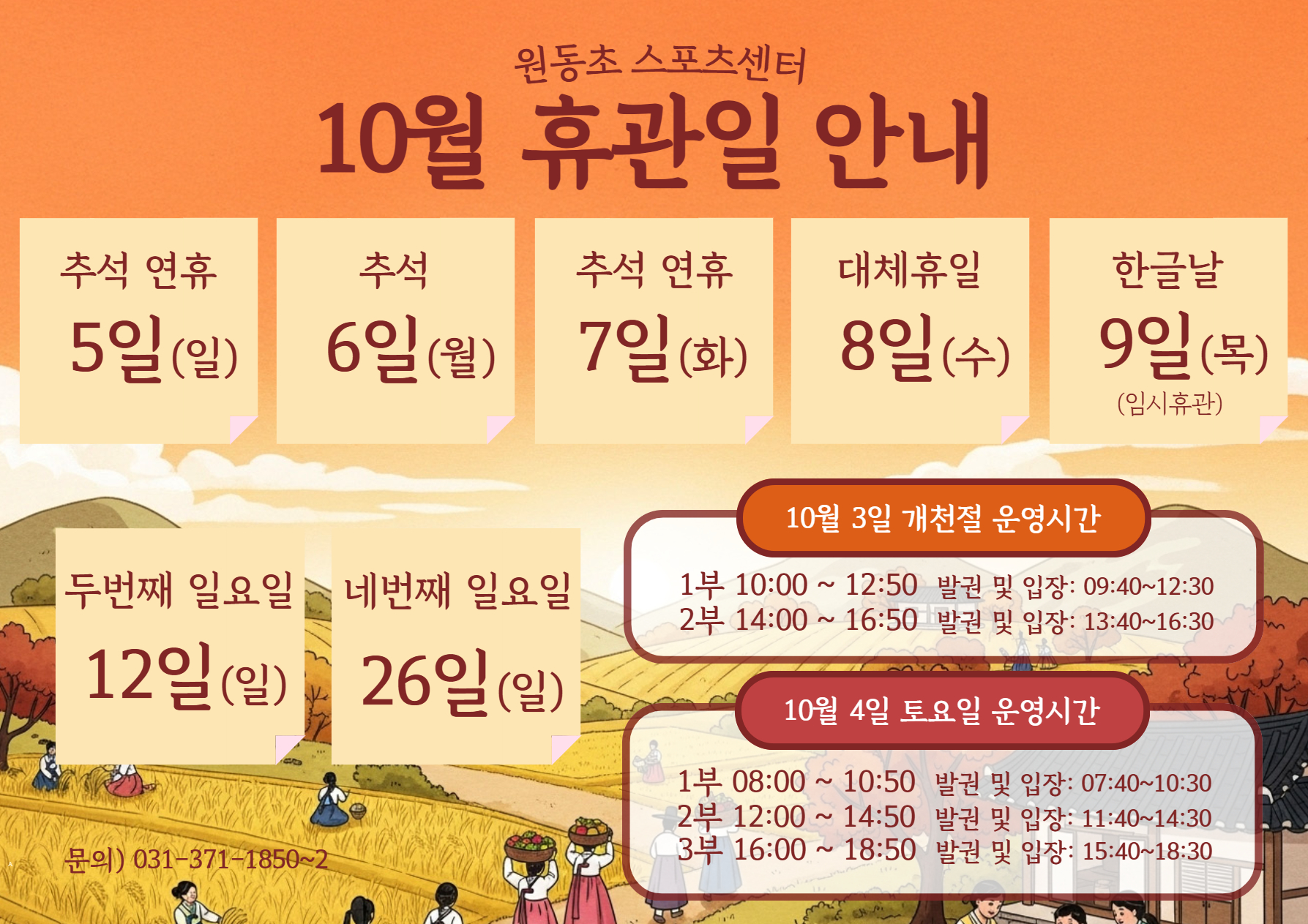 원동초 스포츠센터 [원동] 10월 휴관일 안내 및 개천절 자유수영 운영 안내 작성자 osansisul02 등록일자 2025년 9월 25일 9시 55분 16초 조회 521 원동_휴관일안내_10월.jpg [ Size : 1.62MB , Down : 639 ] 미리보기 다운로드 목록보기
