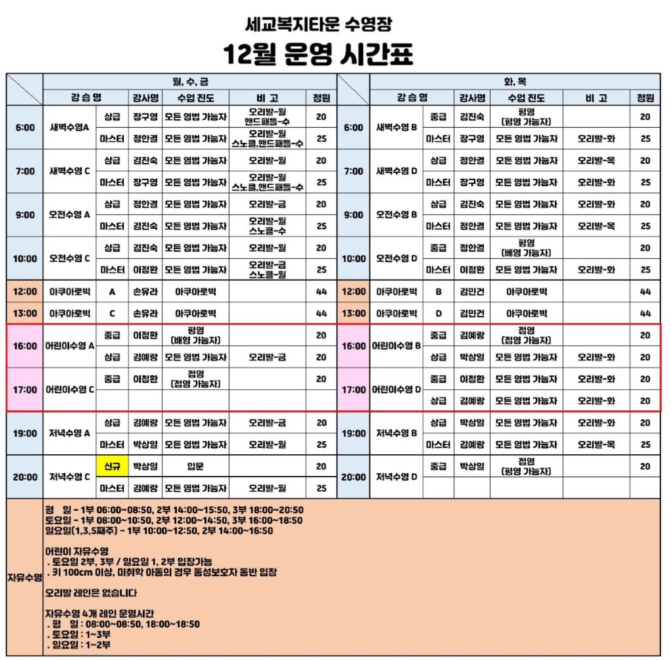 세교복지타운 수영장 12월 강습진도표 작성자 osansisul01 등록일자 2023년 11월 14일 19시 24분 55초 조회 1,975 12월 운영시간표1(홈페이지).jpg [ Size : 295.65KB , Down : 3,531 ] 미리보기 다운로드 12월 운영 시간표2.JPG [ Size : 275.66KB , Down : 3,376 ] 미리보기 다운로드 목록보기