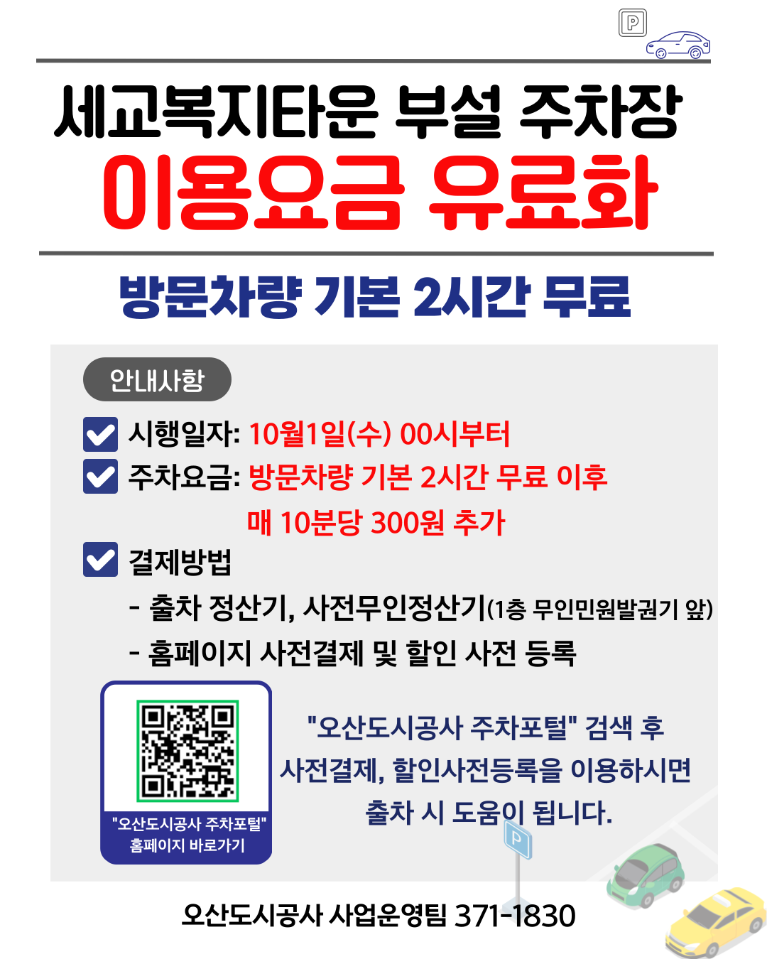 공지 세교복지타운 수영장 [세교] 세교복지타운 부설 주차장 이용요금 유료화(2025년 10월부터 적용) 작성자 osansisul01 등록일자 2025년 8월 27일 10시 10분 47초 조회 813 (세로)주차유료.png [ Size : 218.54KB , Down : 873 ] 미리보기 다운로드 목록보기