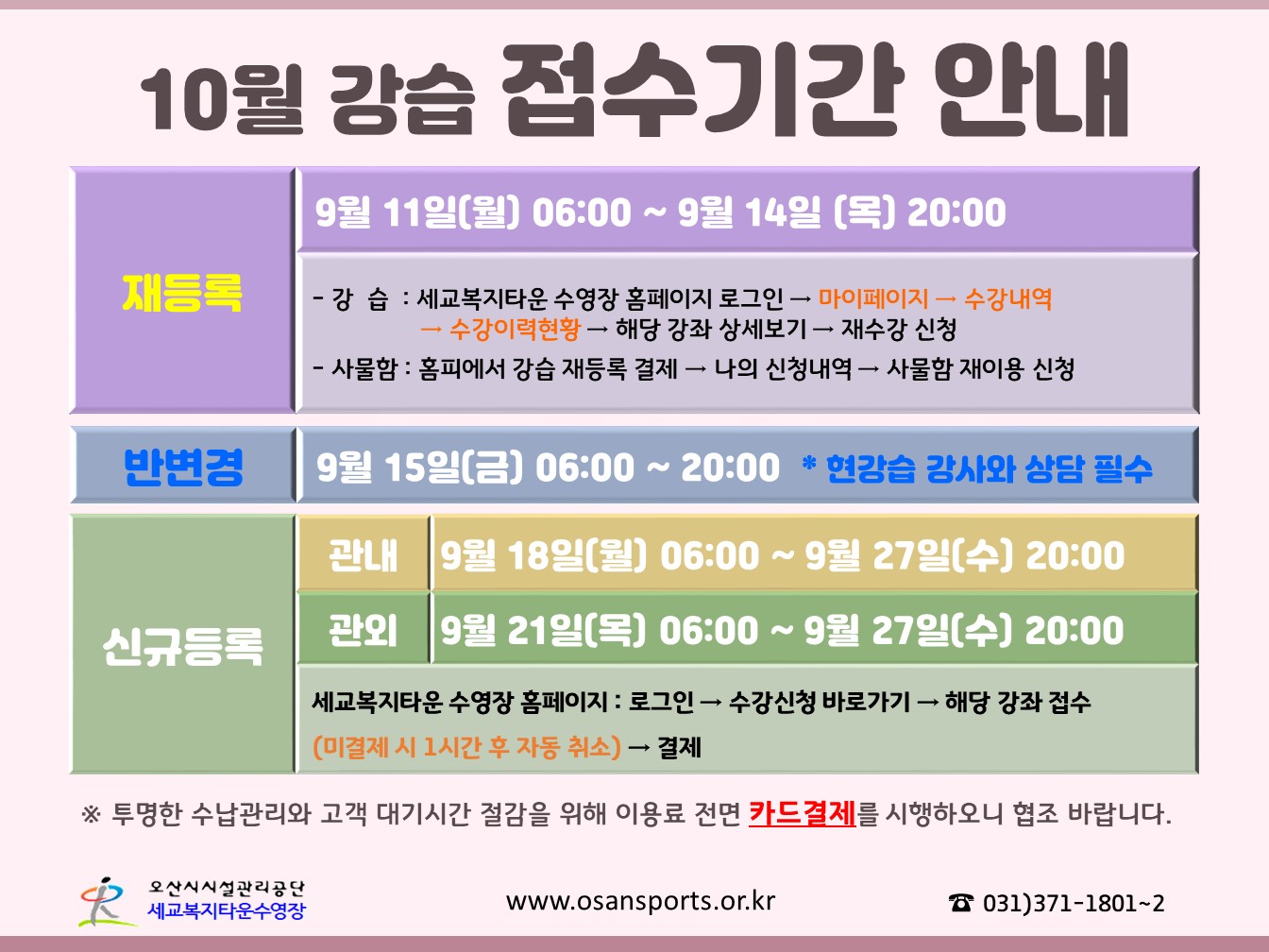 세교복지타운 수영장 10월 강습 접수기간 안내 작성자 osansisul01 등록일자 2023년 8월 29일 10시 22분 10초 조회 1,212 23.10월강습 접수기간 안내.jpg [ Size : 221.26KB , Down : 2,413 ] 미리보기 다운로드 목록보기
