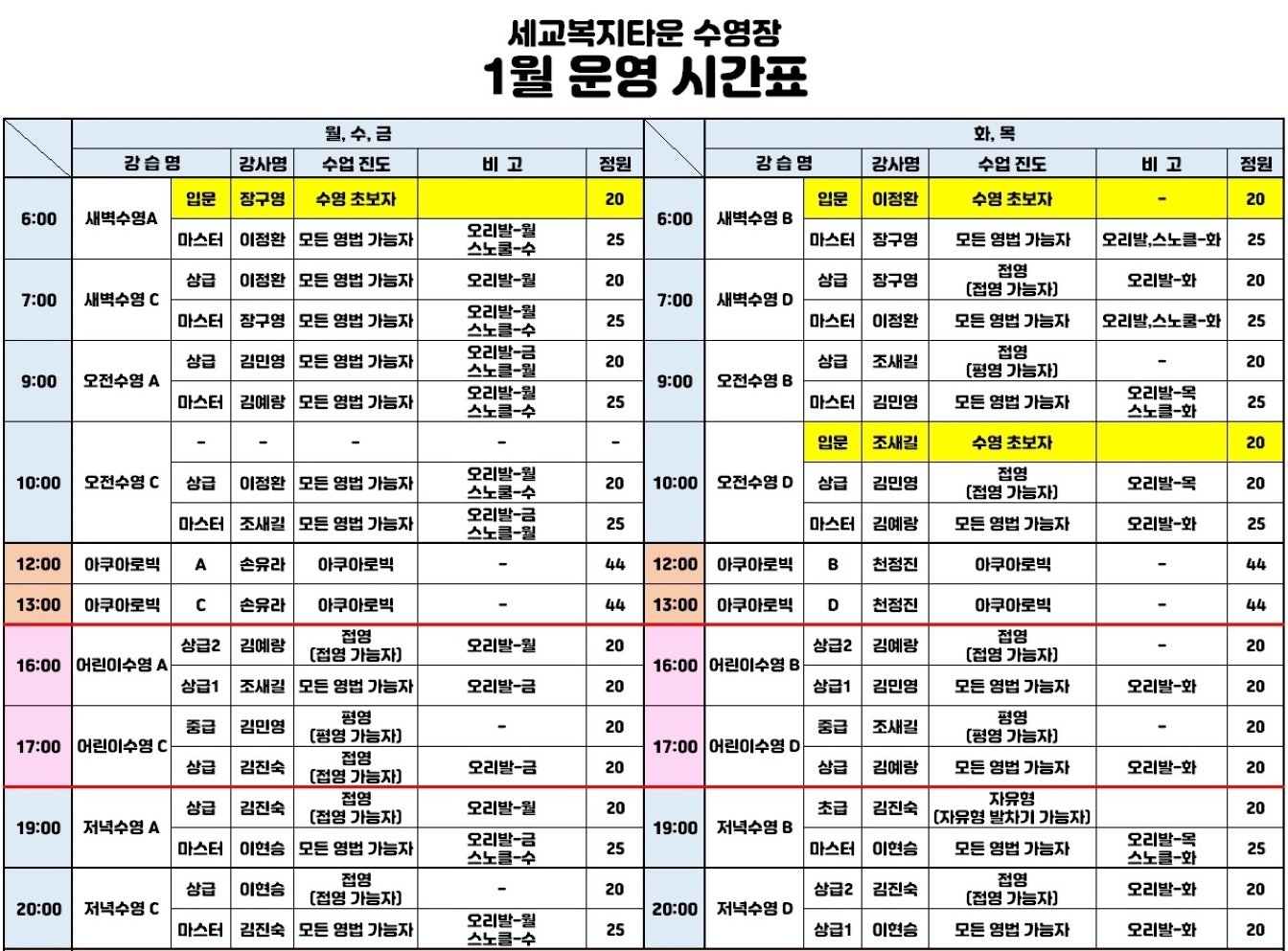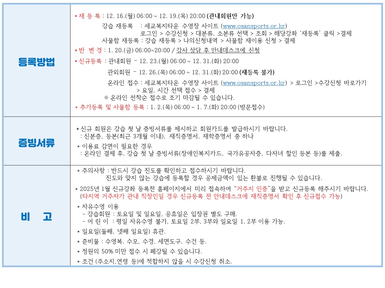 세교복지타운 수영장 [세교] 2025년 1월 강습 진도표 작성자 osansisul01 등록일자 2024년 12월 13일 19시 55분 21초 조회 1,478 1월 강습진도표(가로, 크기조정).jpg [ Size : 684.82KB , Down : 756 ] 미리보기 다운로드 25년 1월 수영 접수 안내문.jpg [ Size : 275.45KB , Down : 656 ] 미리보기 다운로드 목록보기