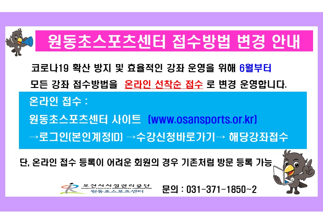 원동초 스포츠센터 원동초스포츠센터 접수방법 변경 안내 작성자 원동센터관리자 등록일자 2020년 5월 16일 9시 59분 1초 조회 2,436 온라인접수 홍보.jpg [ Size : 153.05KB , Down : 285 ] 미리보기 다운로드 목록보기