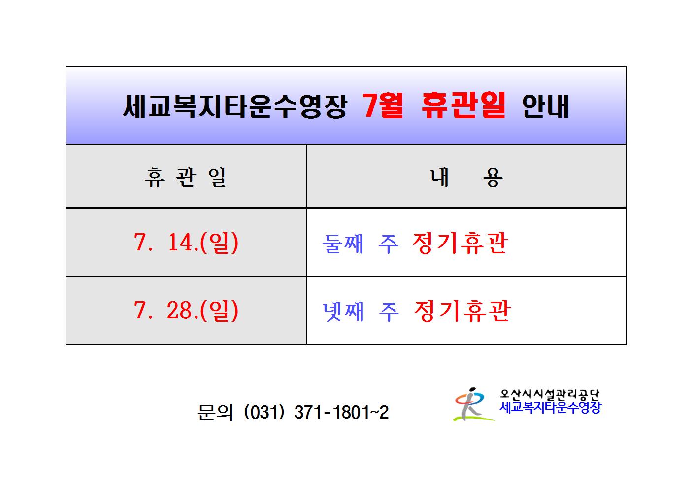 세교복지타운 수영장 7월 휴관일 안내 작성자 세교센터관리자 등록일자 2019년 6월 26일 9시 33분 33초 조회 481 1.세교복지타운 수영장 휴관일 안내001.jpg [ Size : 119.38KB , Down : 124 ] 미리보기 다운로드 1.세교복지타운 수영장 휴관일 안내002.jpg [ Size : 83.59KB , Down : 128 ] 미리보기 다운로드 목록보기