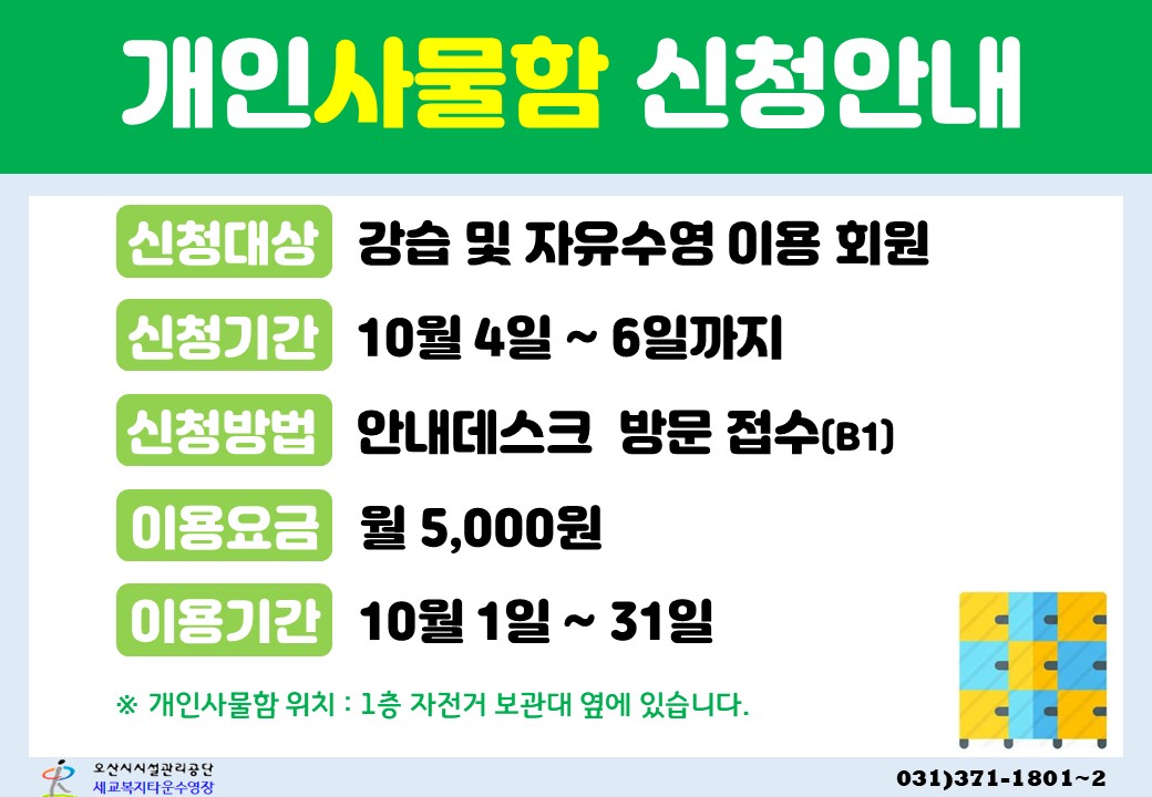 세교복지타운 수영장 10월 개인사물함 신청 안내 작성자 osansisul01 등록일자 2023년 9월 27일 18시 54분 55초 조회 352 10월 개인사물함(홈페이지).jpg [ Size : 130.14KB , Down : 833 ] 미리보기 다운로드 목록보기