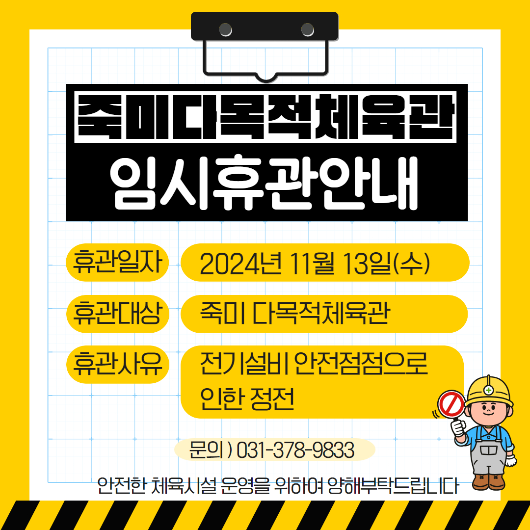 죽미체육공원 [죽미] 죽미다목적체육관 임시휴관 안내 작성자 osansisul04 등록일자 2024년 10월 31일 11시 31분 36초 조회 762 . 죽미다목적체육휴관.jpg [ Size : 602.43KB , Down : 773 ] 미리보기 다운로드 목록보기
